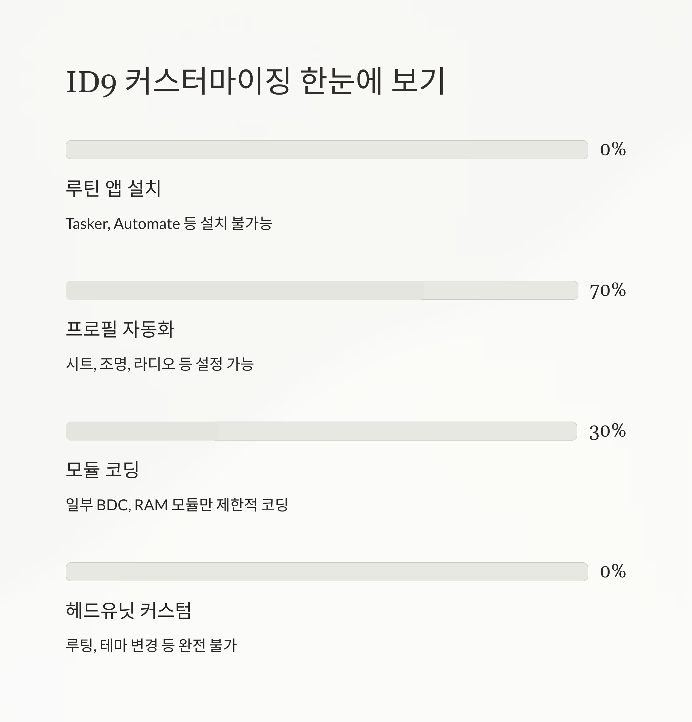 BMW ID9에 대한 커스텀, 루틴, 코딩 가능 여부를 한눈에 보기 쉽게 정리했습니다.
