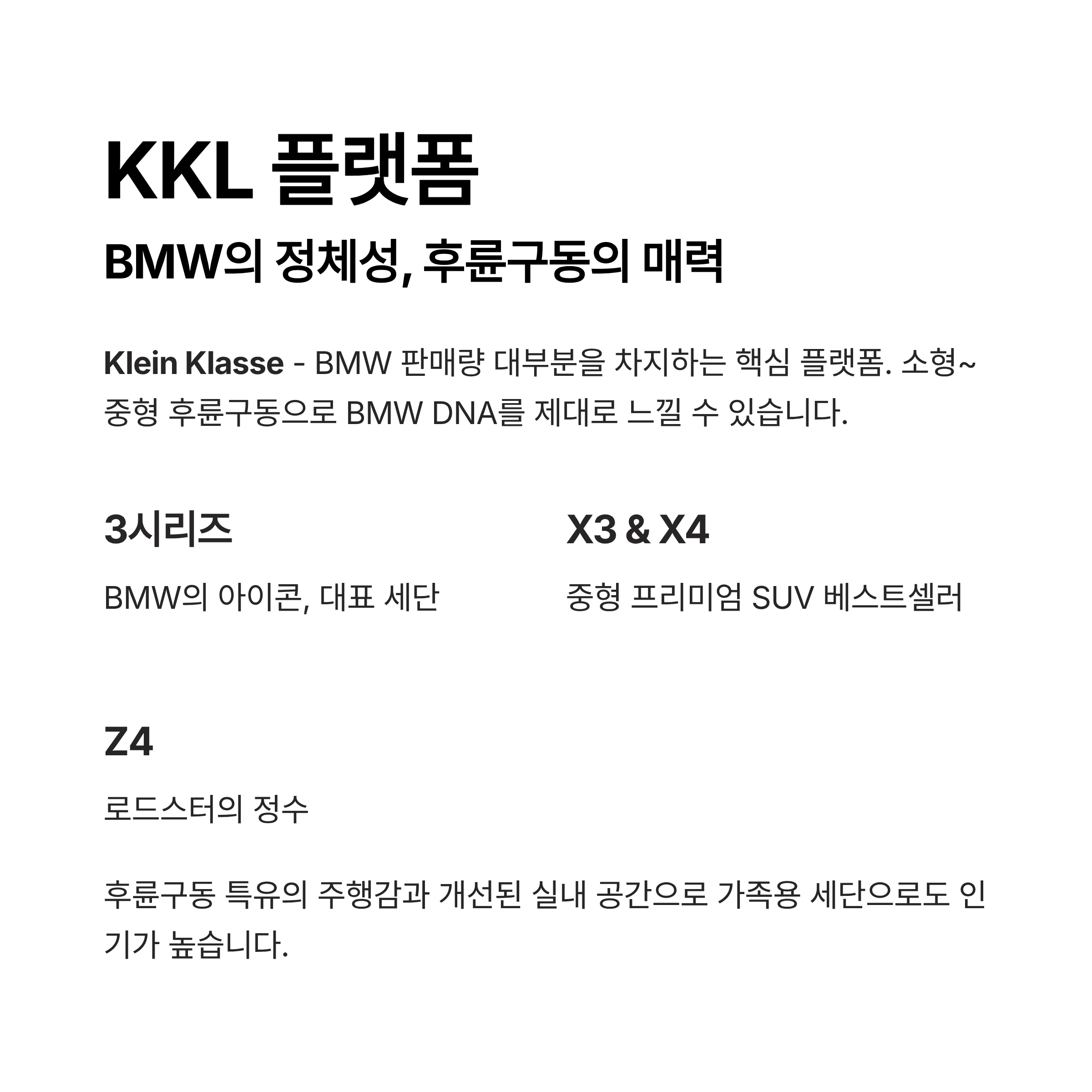 드디어 핵심입니다! KKL은 Klein Klasse의 약자로, BMW의 소형~중형 후륜구동(FR) 플랫폼을 의미합니다. BMW 판매량의 대부분을 차지하는 핵심 플랫폼이죠.