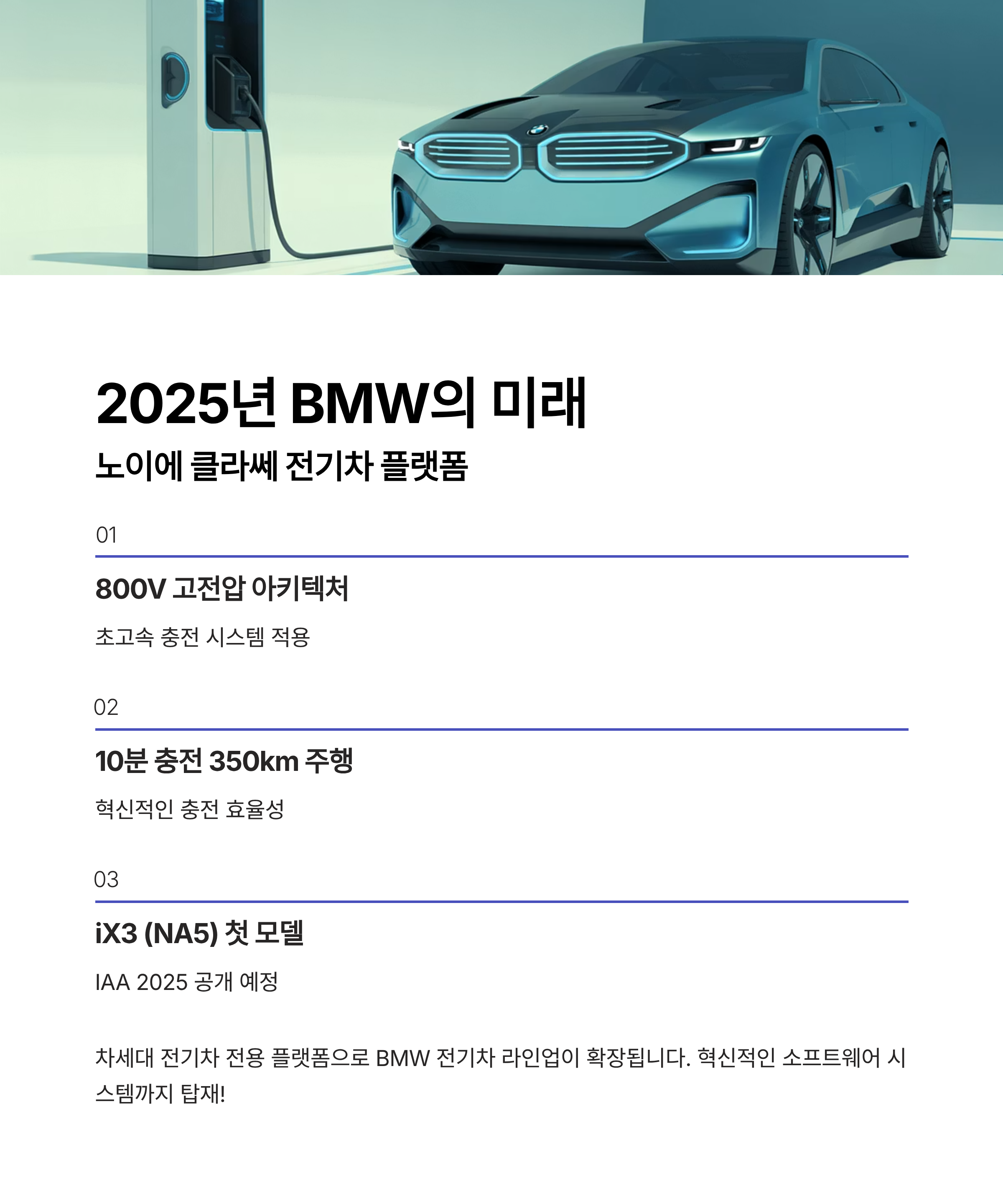 BMW는 2025년 차세대 전기차 전용 플랫폼 '노이에 클라쎄(Neue Klasse)'를 본격 도입합니다. 800V 고전압 아키텍처, 10분 충전으로 350km 주행, 그리고 혁신적인 소프트웨어 시스템까지!