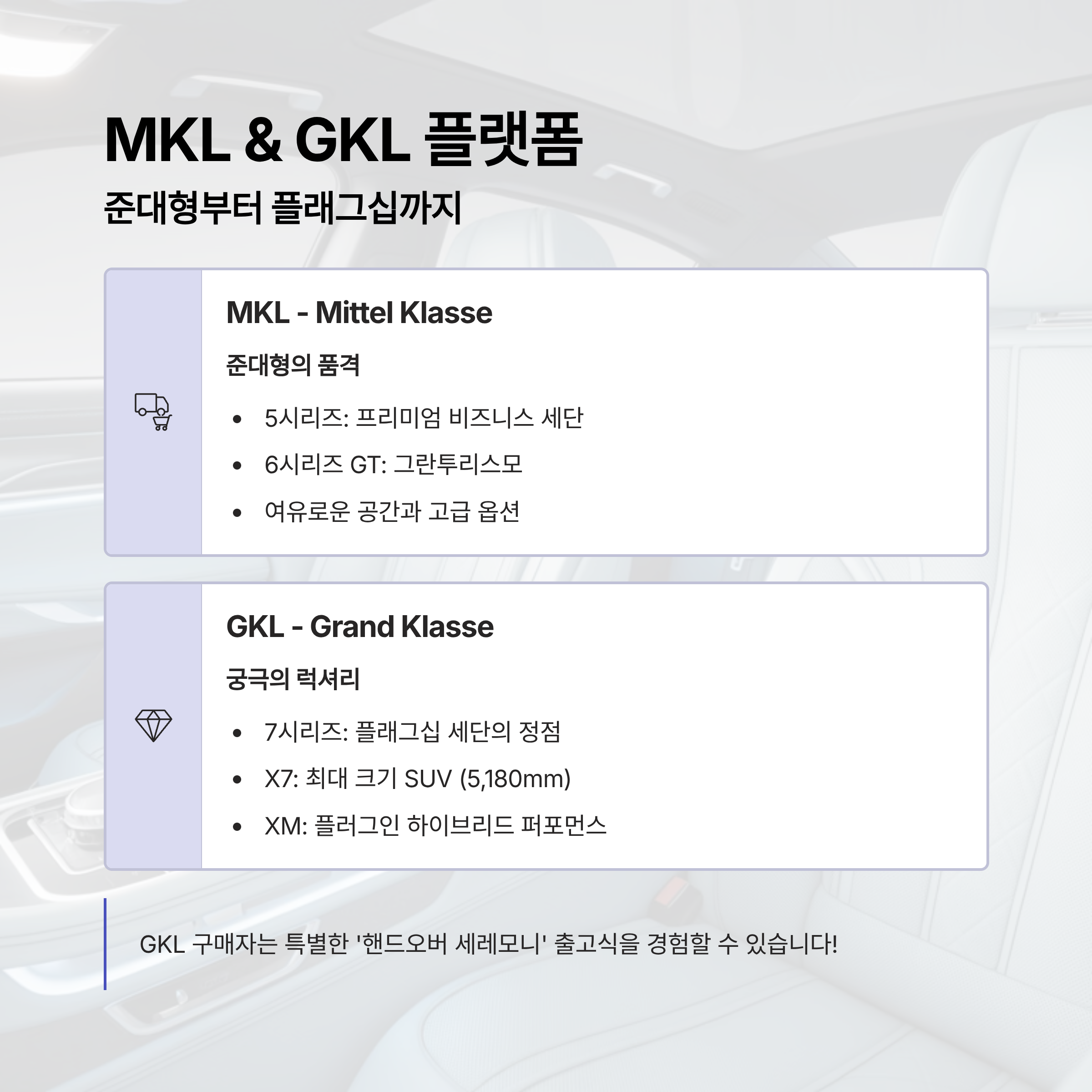 💎 GKL 차량 구매 시 특별 혜택! GKL 라인업 구매자는 BMW 공식 딜러에서 제공하는 '핸드오버 세레모니'라는 특별한 출고식을 경험할 수 있습니다. VIP 대우를 받으며 차량을 인수받는 특별한 순간을 만들어보세요.