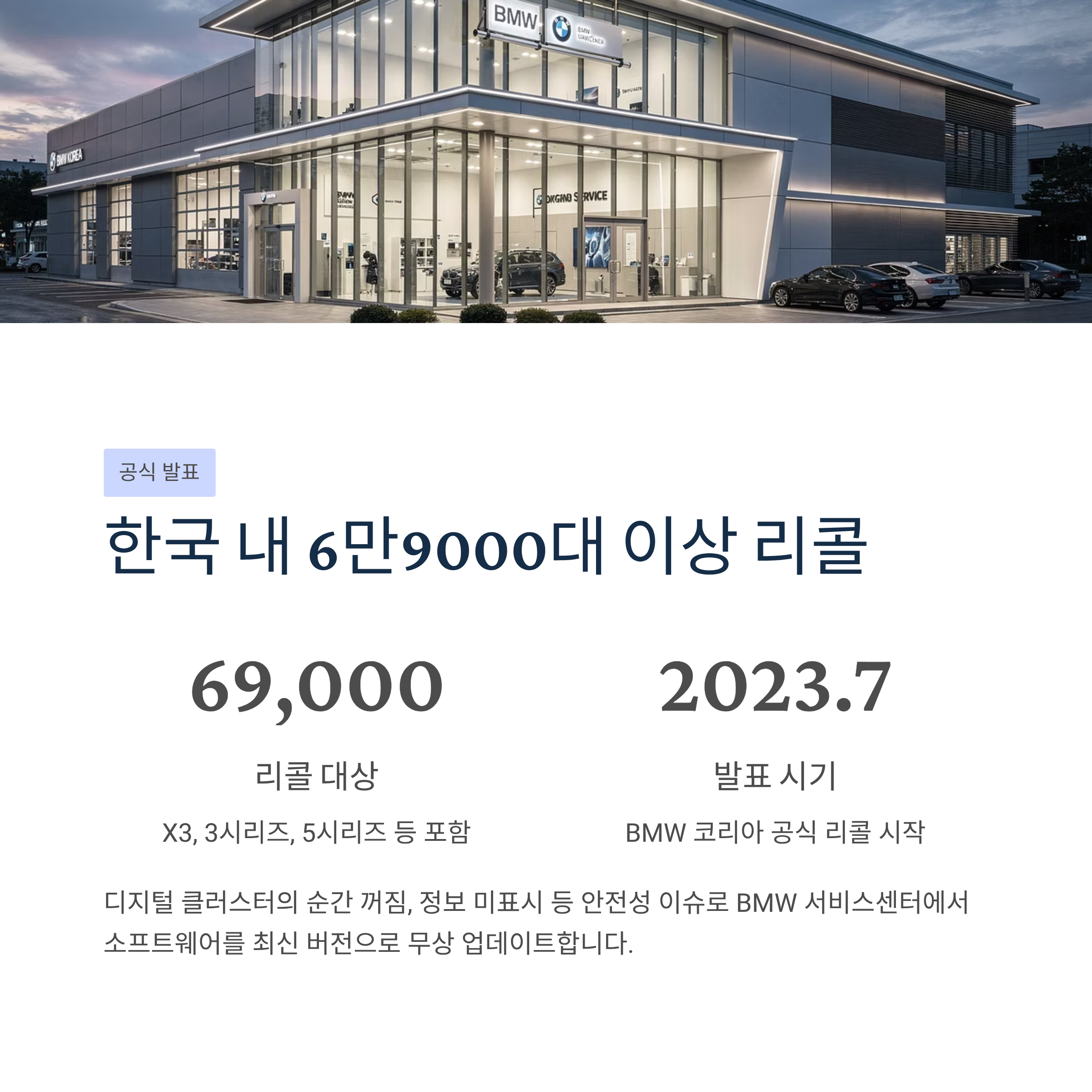 BMW 코리아는 2023년 7월부터 계기판 소프트웨어 결함으로 인한 리콜을 공식 발표했습니다.