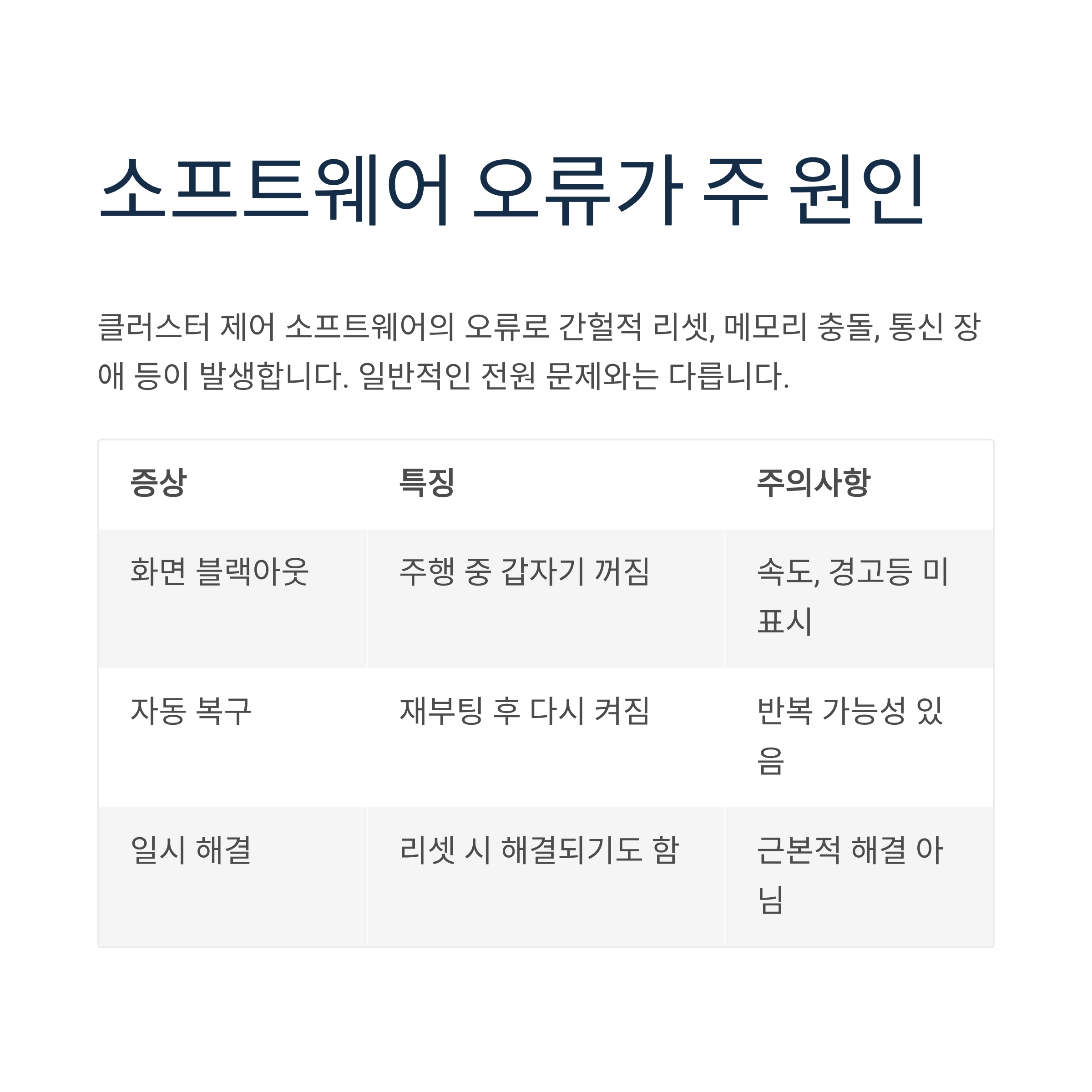 | 화면 블랙아웃 | 주행 중 갑자기 꺼짐 | 속도, 경고등 미표시 |