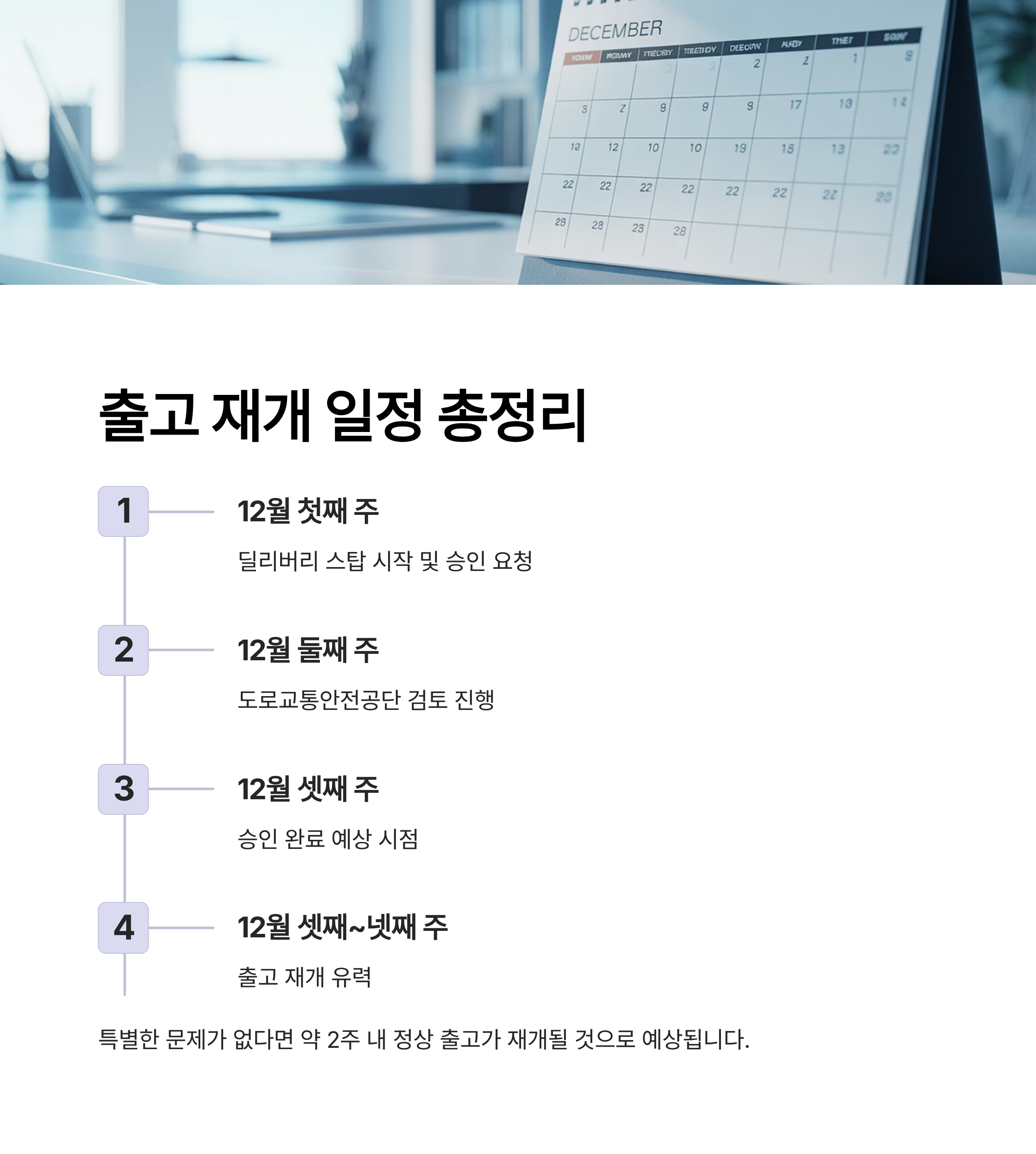 딜리버리 스탑이 2025년 12월 초에 시작되었으므로, 승인 절차가 순조롭게 진행된다면 2025년 12월 셋째 주경부터 출고 재개가 유력합니다. 다만, 공단의 검토 과정에서 추가 보완 요청이 있을 경우 약간의 변동 가능성은 존재합니다.