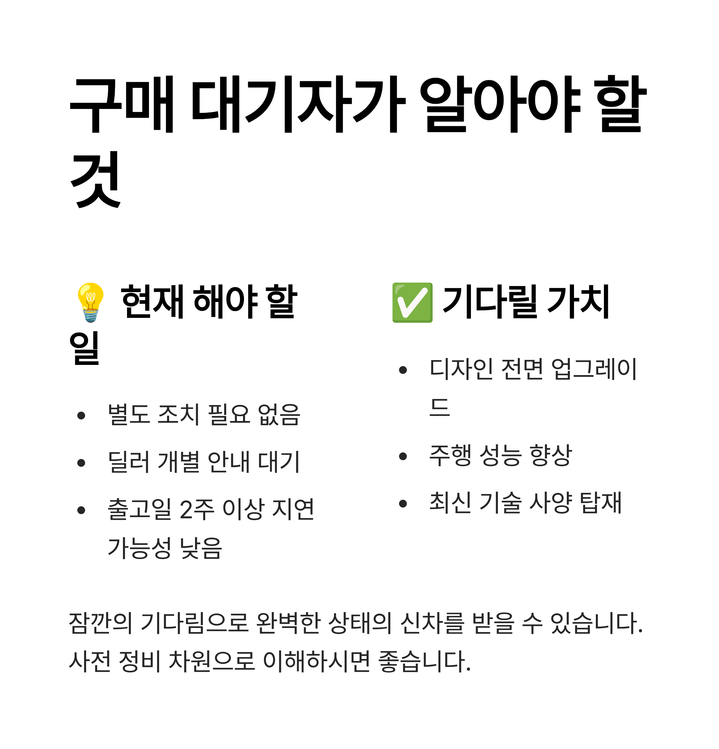계약을 마치고 출고를 기다리는 고객이라면, 현재는 대기 외에 별도의 조치는 필요하지 않습니다. 출고 예정일이 2주 이상 지연될 가능성은 낮으며, 딜러를 통해 개별적인 안내가 이루어질 예정입니다.
