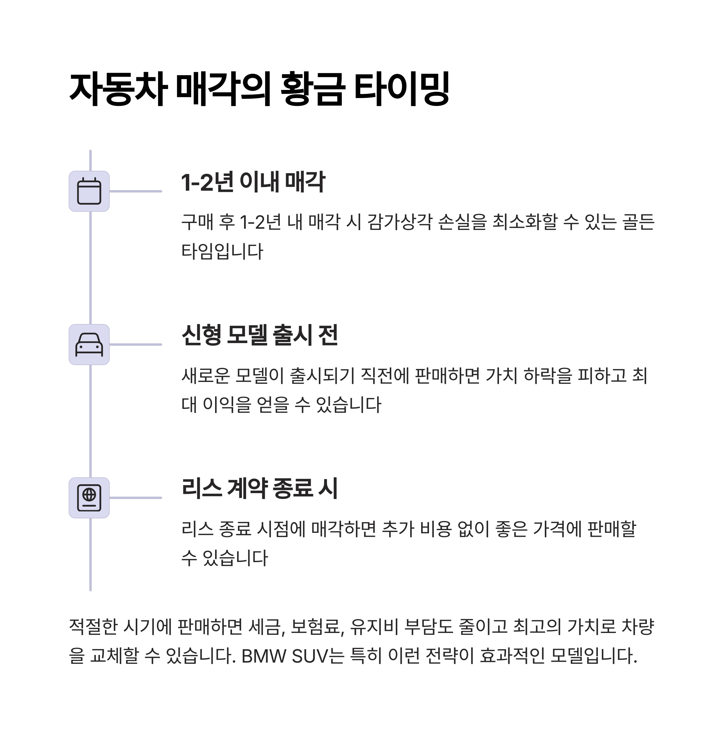 결국 차량을 오래 보유할수록 되팔 때 손해를 보는 구조입니다. 특히 BMW와 같은 수입차는 보증기간이 종료된 이후부터 정비 비용이나 중고차 가치 하락 리스크가 급증하기 때문에, 보유 기간을 짧게 가져가는 것이 유리합니다.