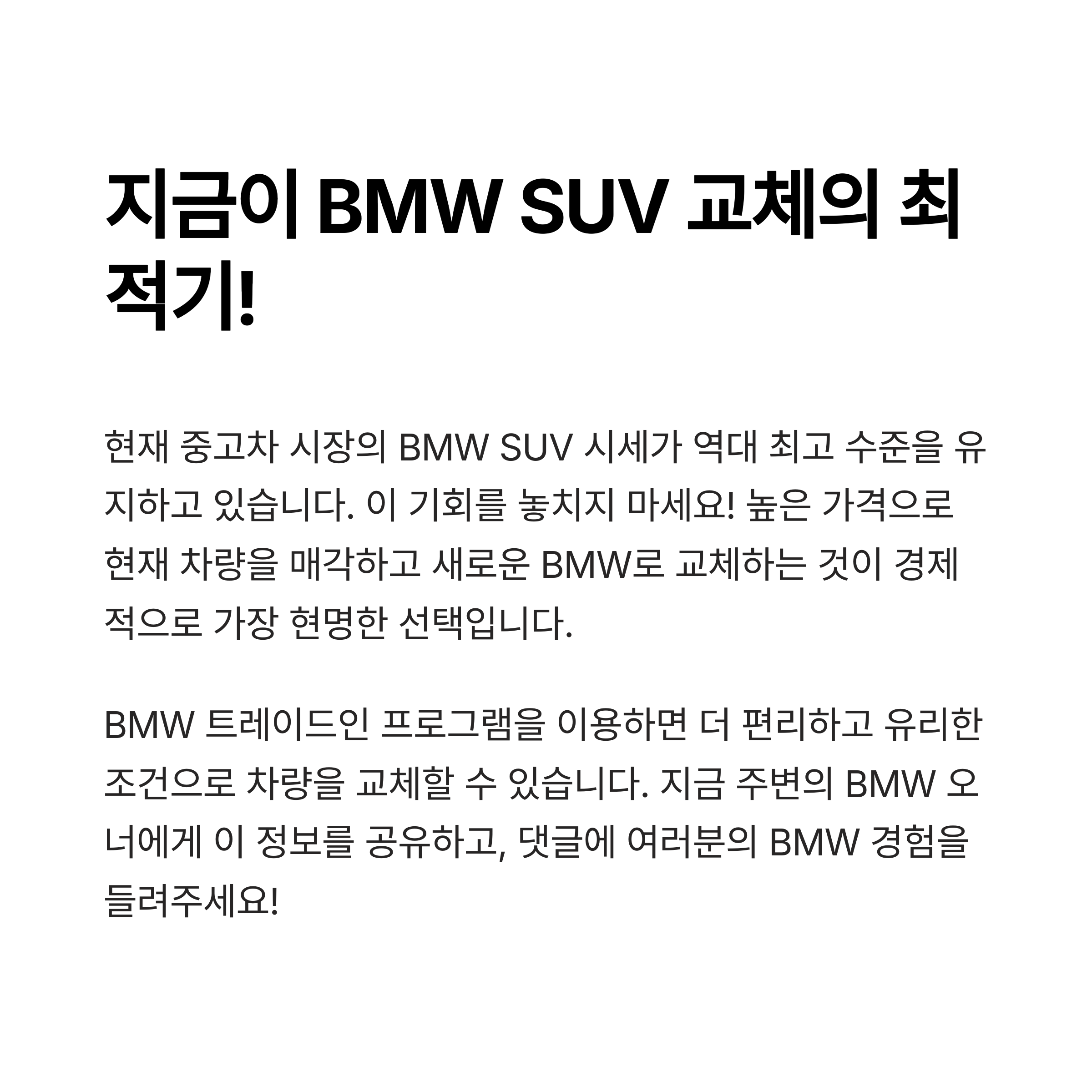BMW X5, X6, X7은 단순한 차량이 아니라 ‘가치 있는 자산’처럼 운용이 가능한 프리미엄 SUV입니다. 현재 중고차 시장의 이례적인 호황은 단기간에 끝날 수 있는 일시적인 흐름이며, 지금 이 타이밍을 잘 활용한다면 오히려 차량을 타고 수익을 내는 결과를 만들 수 있습니다.