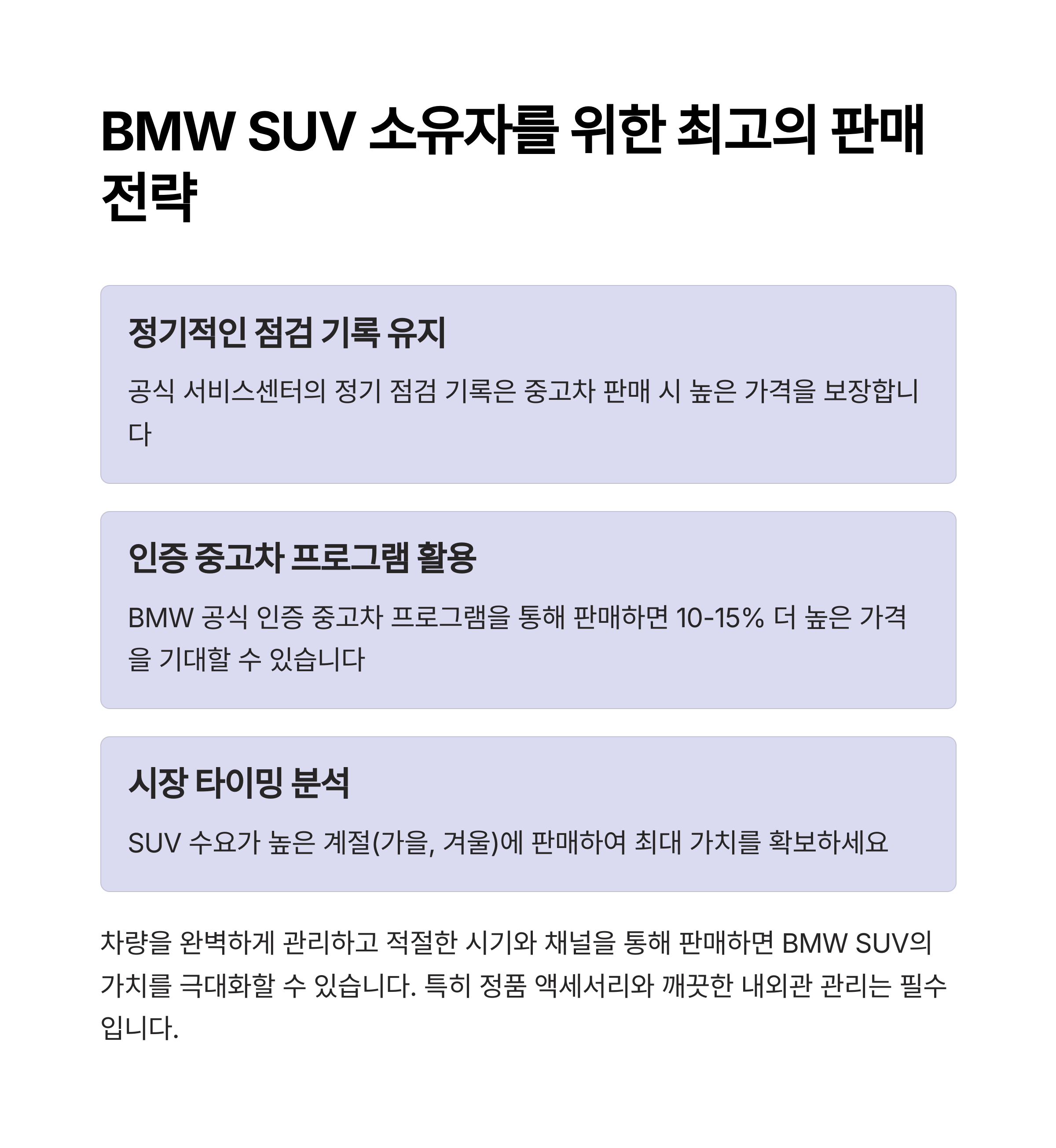 하지만 1~2년 내에 차량을 매각하면 이러한 장기적인 유지비 리스크를 피할 수 있습니다. 특히 BMW는 ‘5년 10만km 보증’ 등의 프로그램이 있기 때문에, 보증 내 차량을 매도하면 구매자에게도 매력적인 상품이 됩니다.