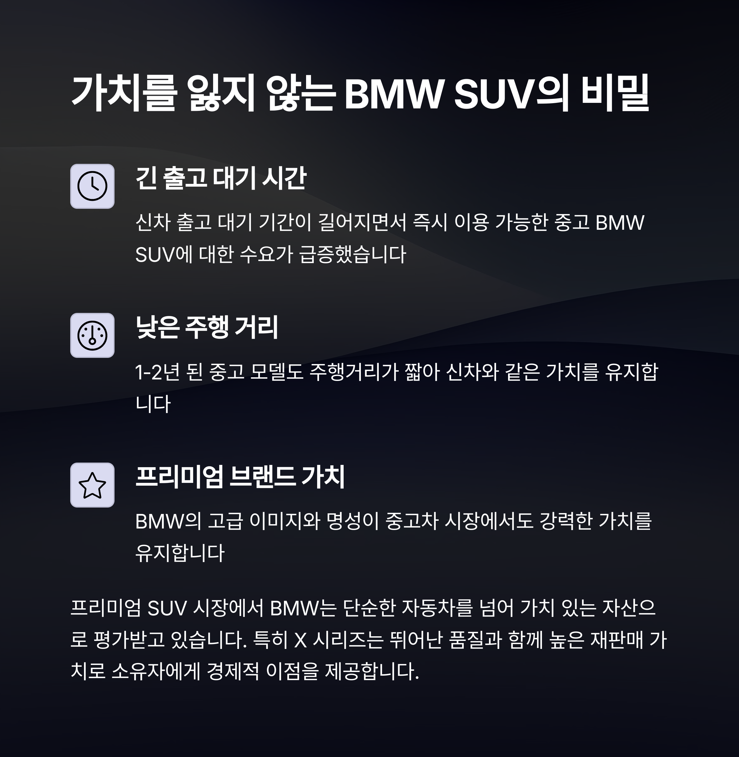첫째, 이 모델들은 BMW의 대표 프리미엄 SUV로, 고급스러운 내외관과 강력한 주행성능, 최신 옵션을 모두 갖추고 있습니다. 둘째, 대기 기간 없이 바로 탈 수 있는 매물이 귀하다 보니, 당장 차량이 필요한 소비자들이 중고차 시장으로 몰리고 있습니다.