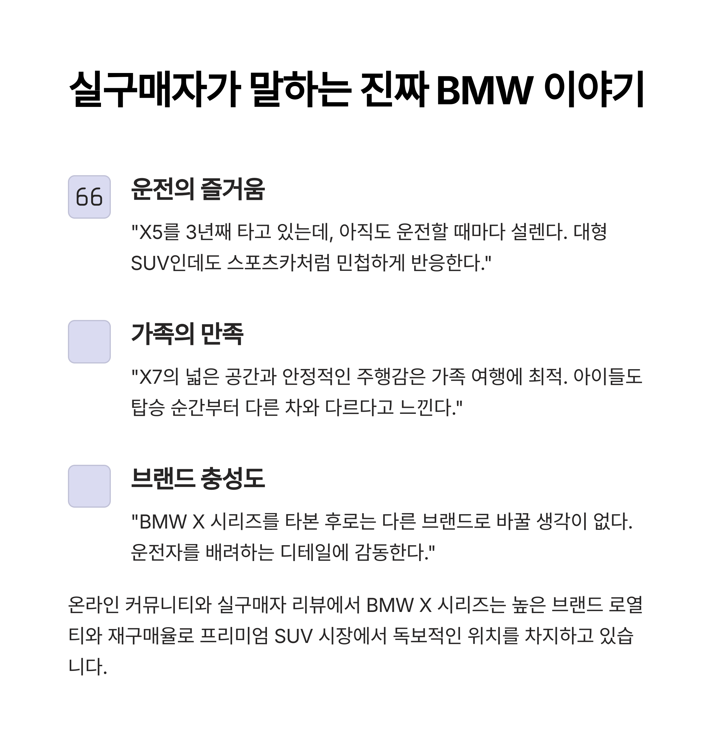 “다시 SUV를 산다면 또 BMW”라는 반응이 많고,