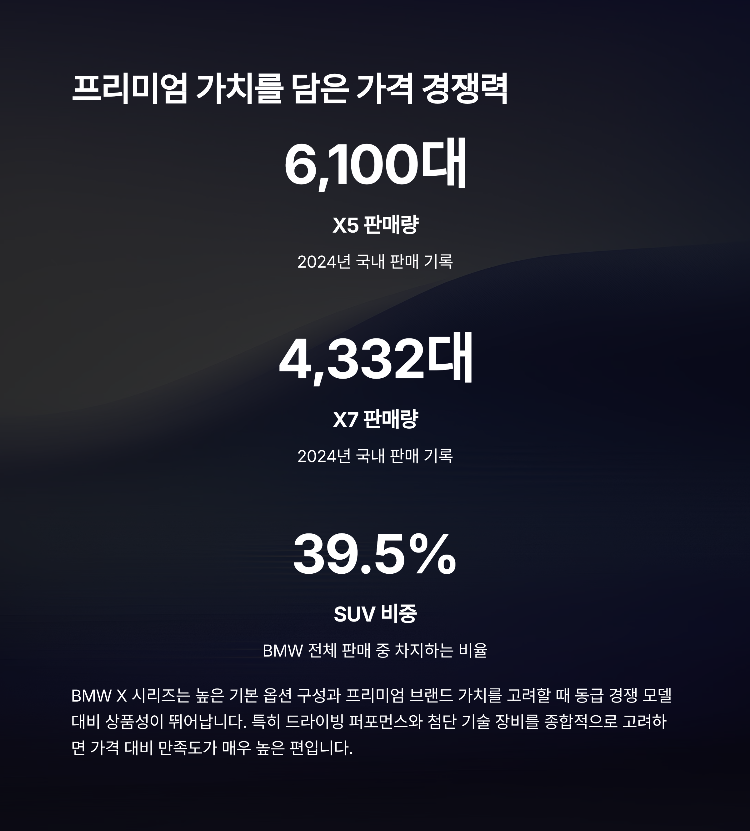특히 X6는 쿠페형 SUV라는 독보적 존재감으로 시장에서 확실한 포지셔닝에 성공했습니다.