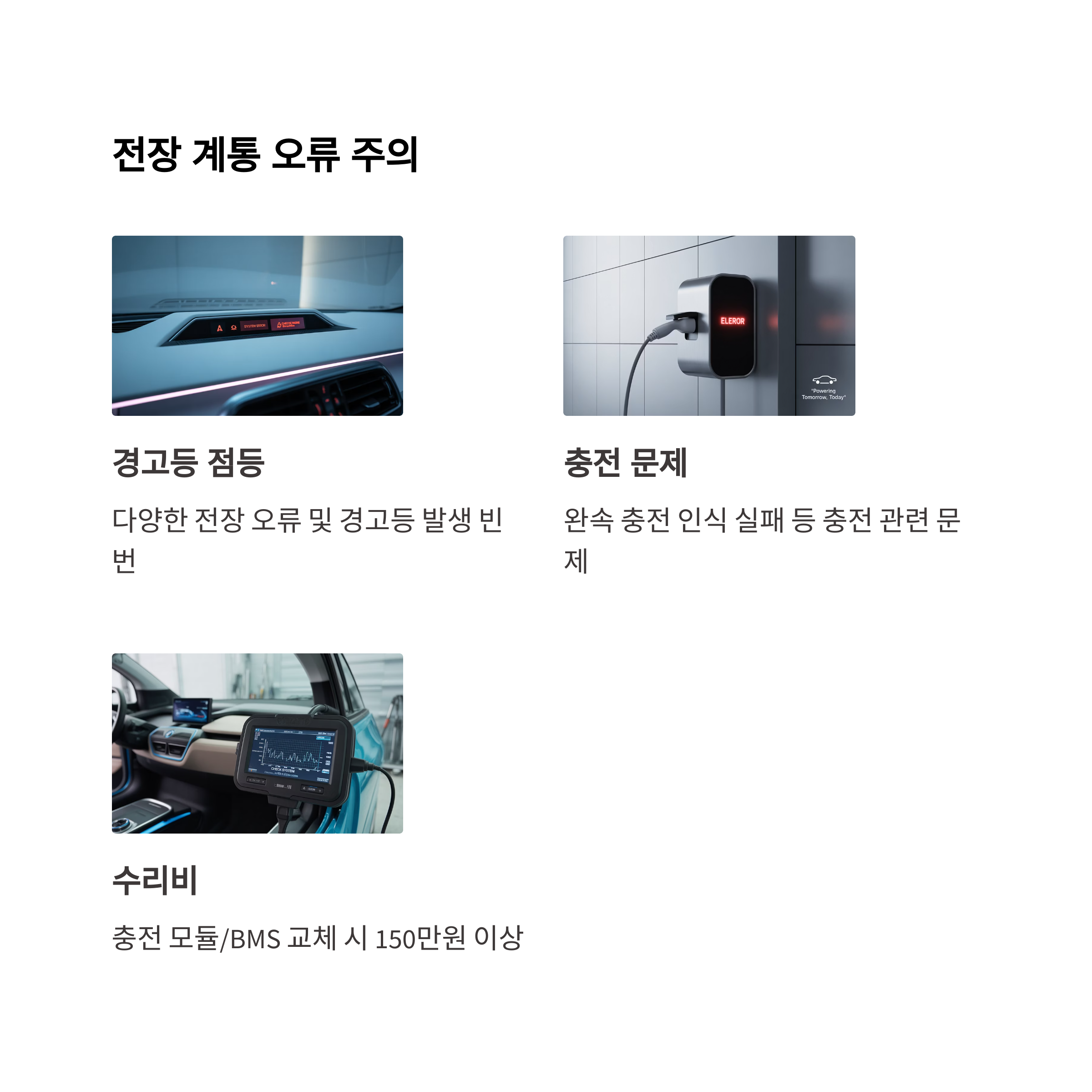 전기차 특성상 전장 시스템에 대한 의존도가 매우 높습니다. i3는 디스플레이 경고등 점등, 내비게이션 오류, 혹은 완속 충전 인식 실패 등 다양한 전장 문제들이 보고됩니다.