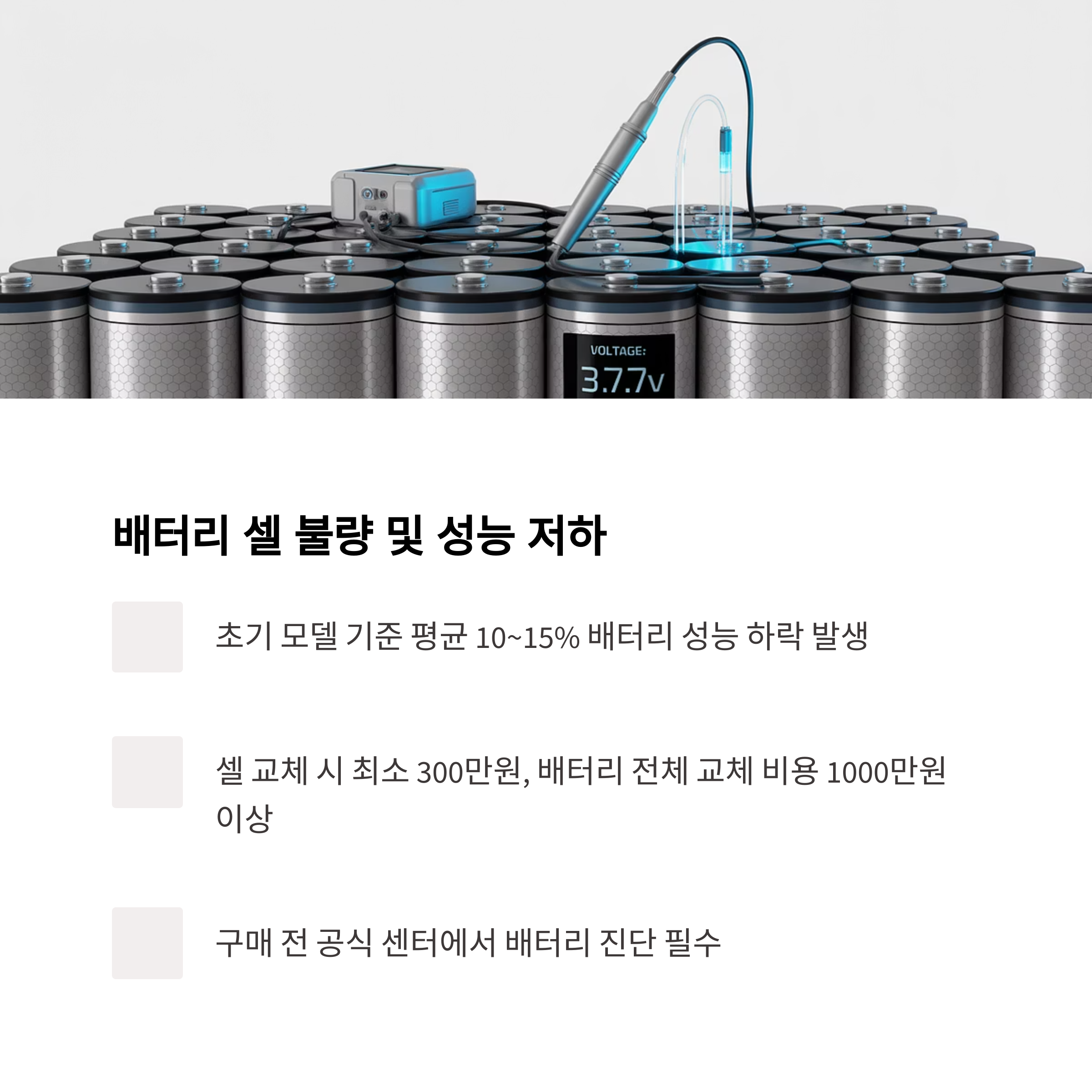 공식 센터에서 배터리 진단을 받아보는 것이 좋으며, 셀 교체가 필요한 경우 최소 300만 원 이상이 들어갑니다. 배터리 전체 교체 시에는 약 1000만 원 이상의 고비용이 발생할 수 있습니다.