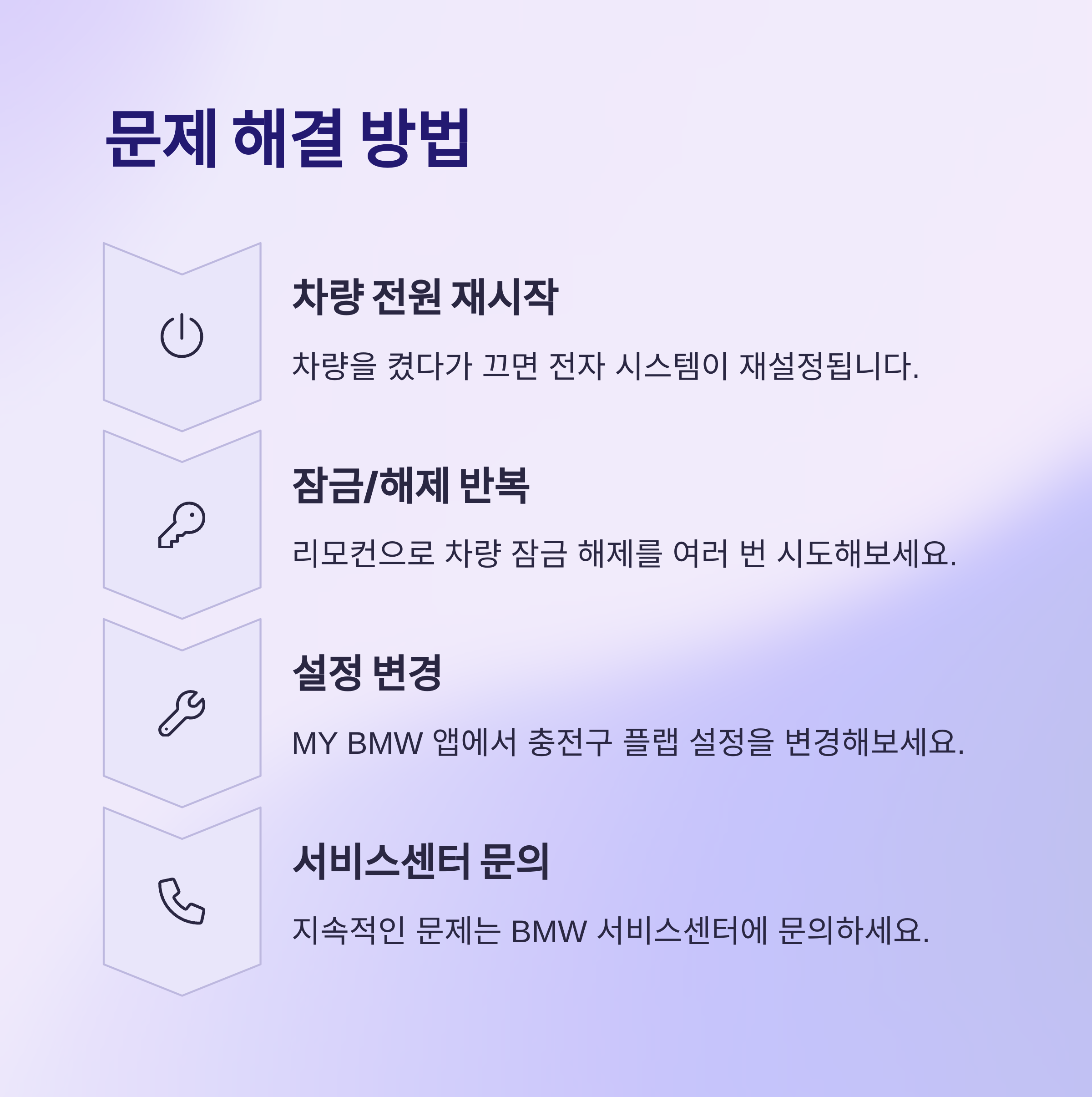 플랩을 무리하게 열려고 할 경우 부품이 손상될 수 있으므로, 비상 상황에서는 조심해야 합니다. 만약 충전구 플랩이 계속 열리지 않는다면 BMW 서비스센터에 문의하는 것이 좋습니다.