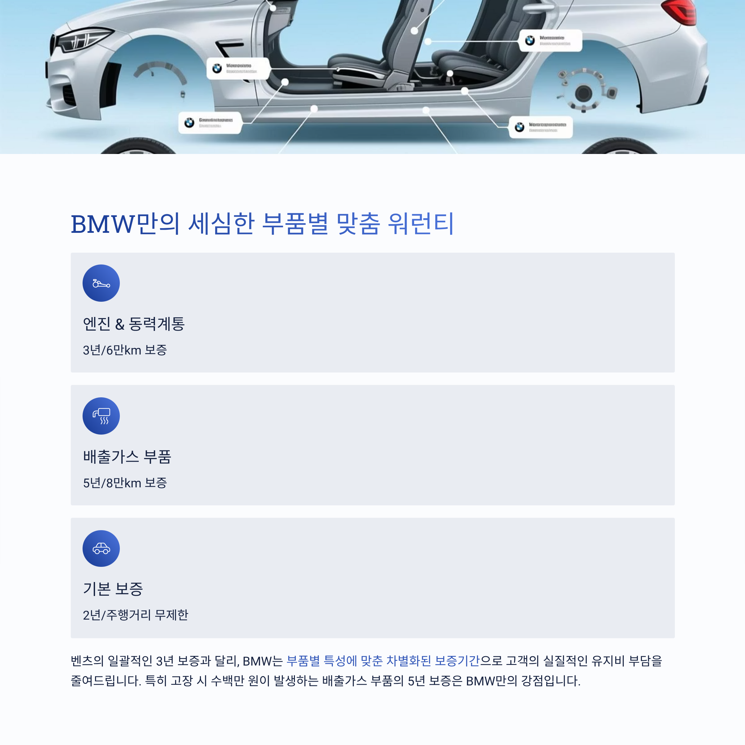 BMW는 2년 무제한 주행거리 보증을 제공해 초기 보증 범위가 넓습니다. 다만 엔진, 배출가스 등 주요 부품은 각각 3년 6만km, 5년 8만km로 세분화되어 적용됩니다. 즉, 보증 기간이 항목별로 나눠져 있어 이해가 필요합니다.