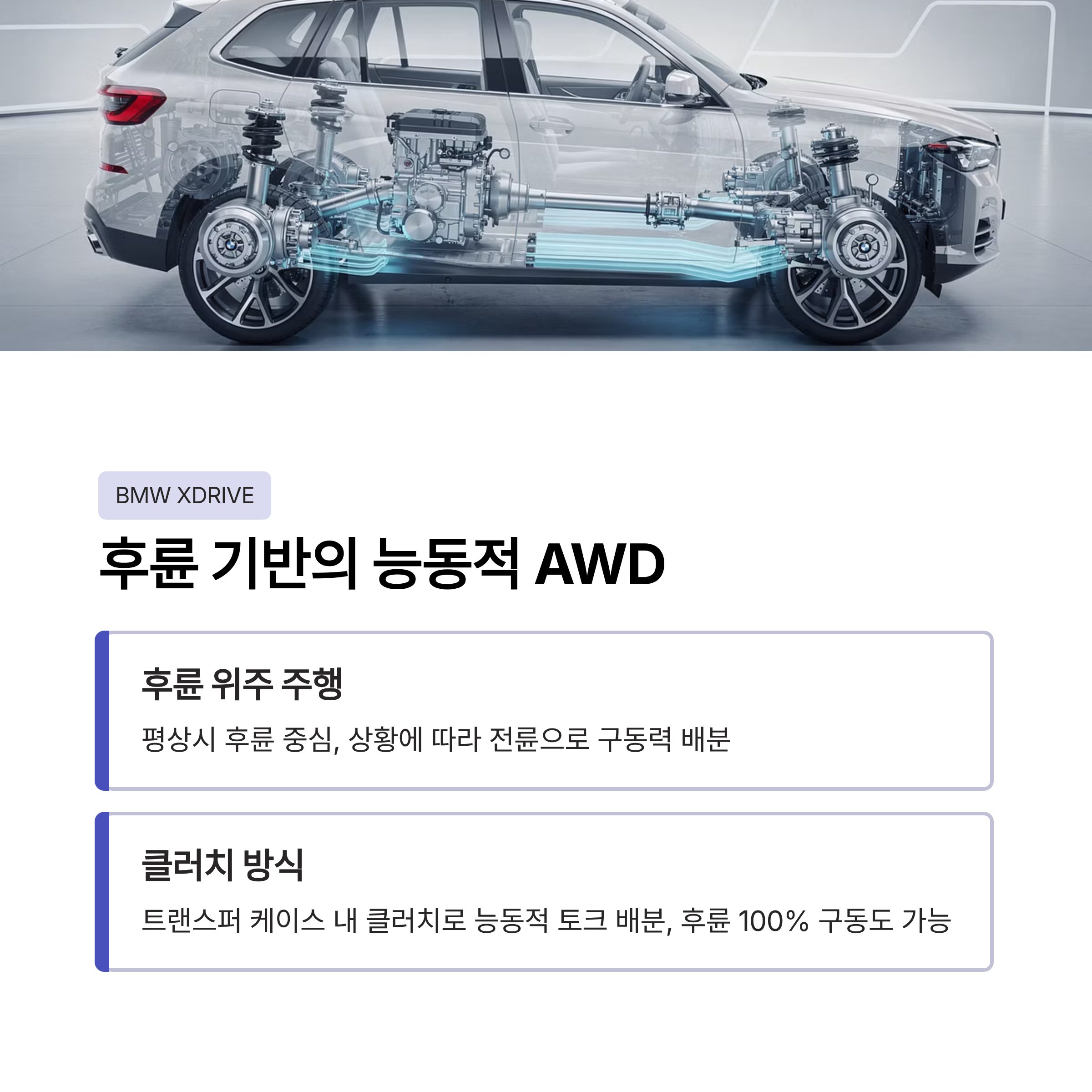 먼저 BMW xDrive는 기본적으로 후륜 기반의 AWD 시스템입니다. 평상시에는 후륜 위주의 주행을 하면서 상황에 따라 전륜으로 구동력을 보내는 구조입니다. 특히 트랜스퍼 케이스 내부의 클러치를 통해 능동적으로 토크를 배분하기 때문에, 필요하다면 후륜 100% 구동도 가능합니다. 쉽게 말해 “구동 자체로 해결하는 4륜 시스템”이라고 볼 수 있습니다.