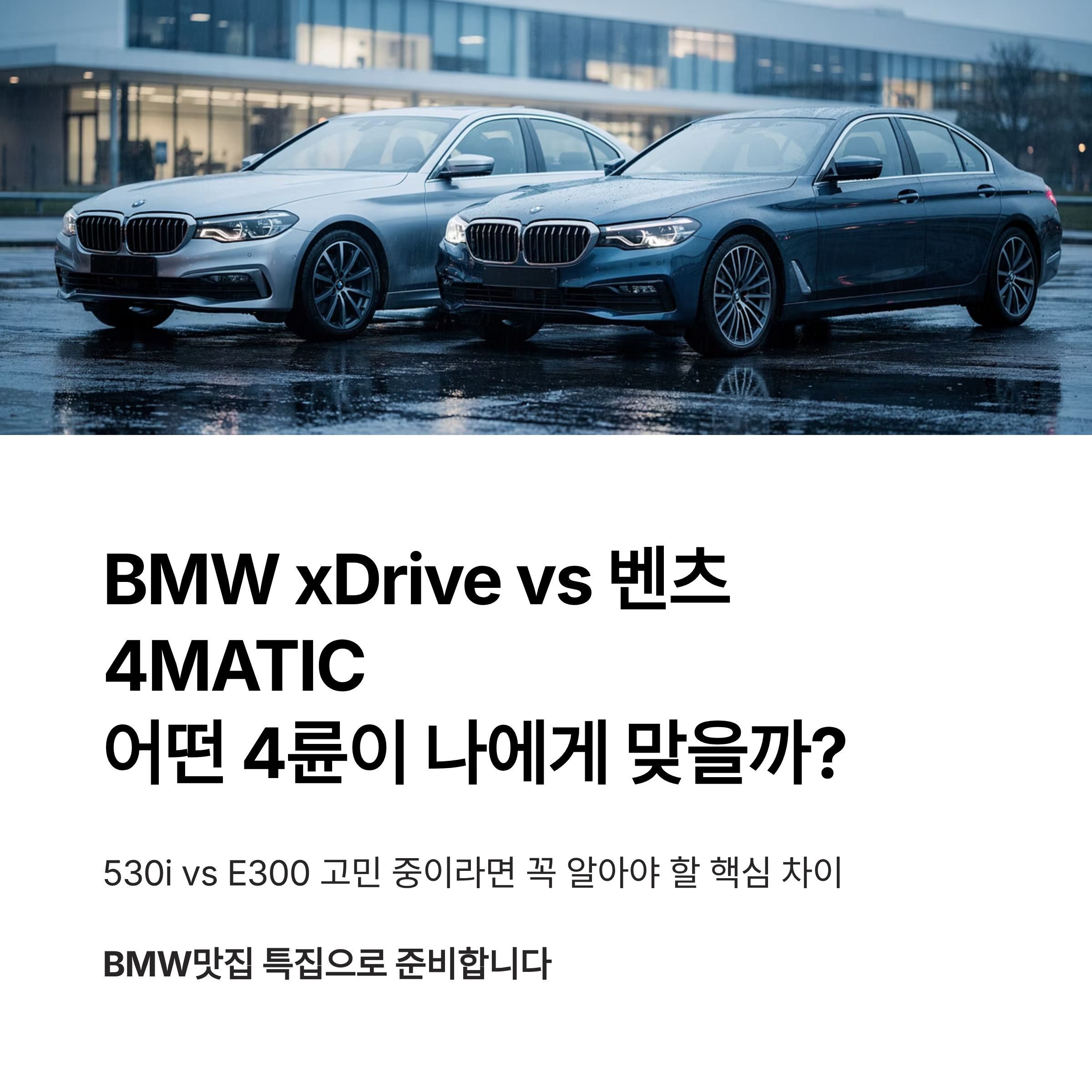 BMW 530i vs 벤츠 E300을 고민하는 분들이라면 한 번쯤 들어봤을 비교가 있습니다. 바로 BMW의 xDrive와 벤츠의 4MATIC 차이입니다. 같은 4륜구동 시스템이지만 성격은 꽤 다릅니다.