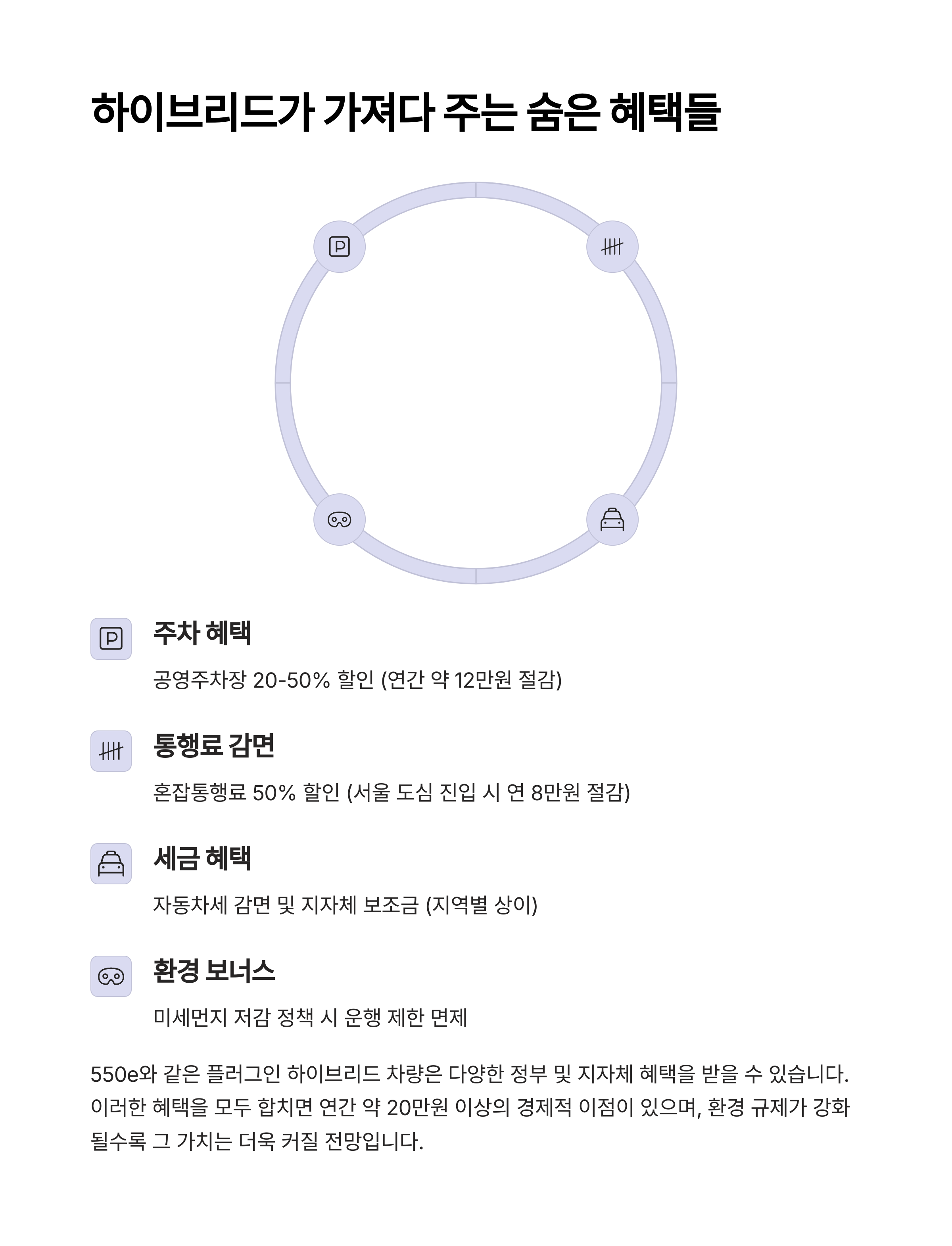 정부나 지자체에서 제공하는 하이브리드 차량 혜택도 큰 결정 요인 중 하나였습니다.
