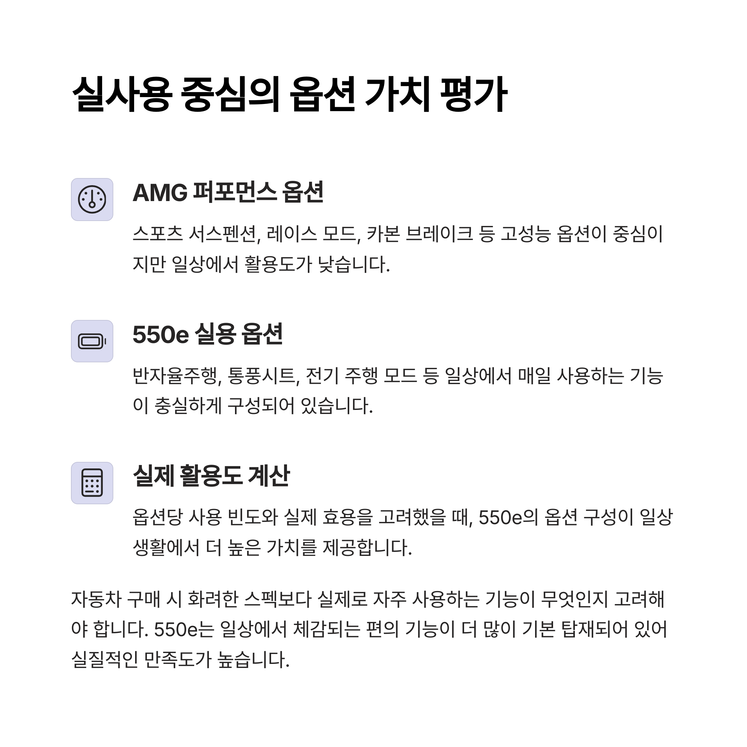 결국 저는 "필요한 기능을 중심으로 구성된 차량"을 택했습니다.