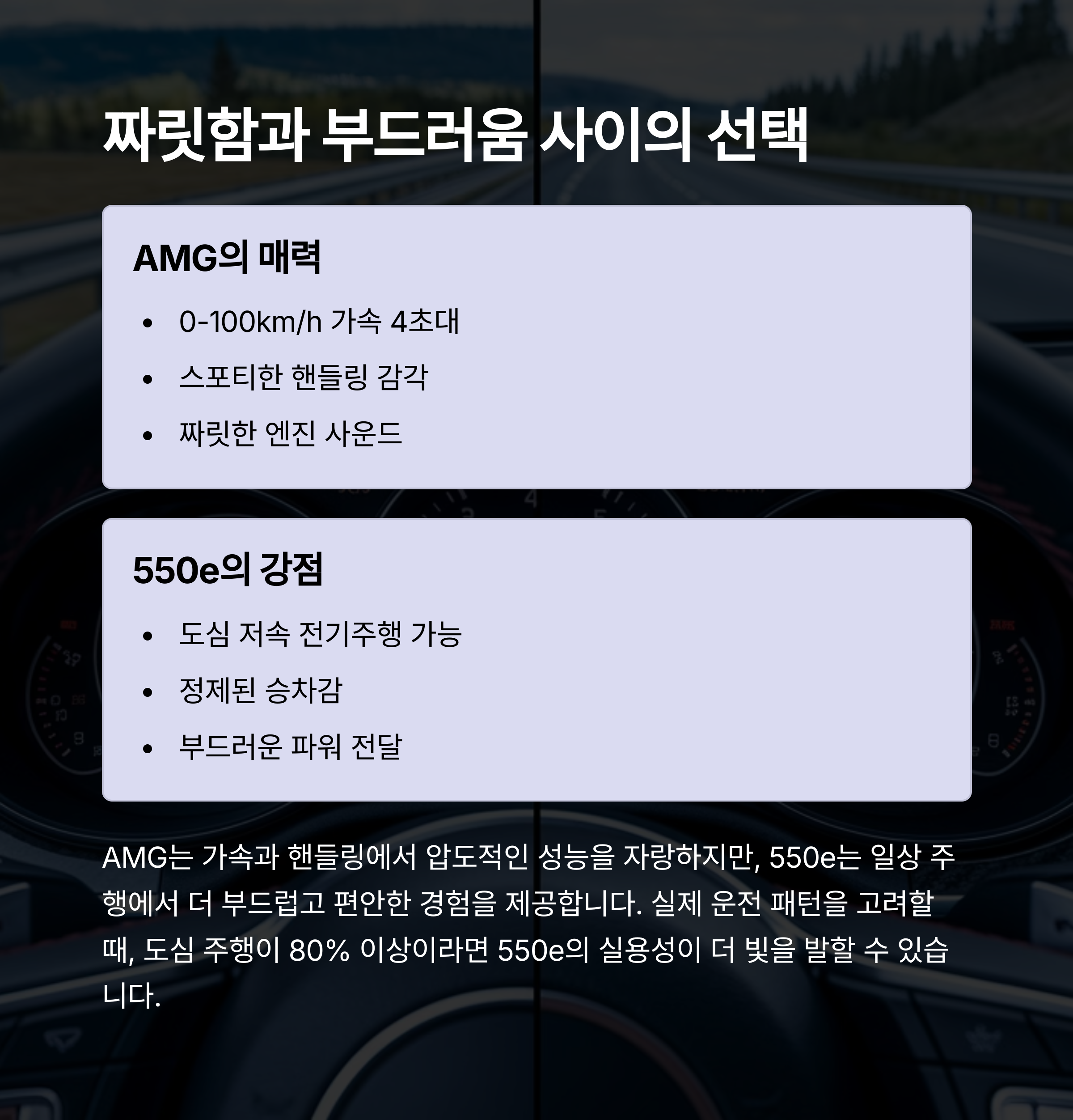 AMG는 물론 멋지고 매력적이지만, 저에게는 지금의 라이프스타일에 맞지 않았습니다.