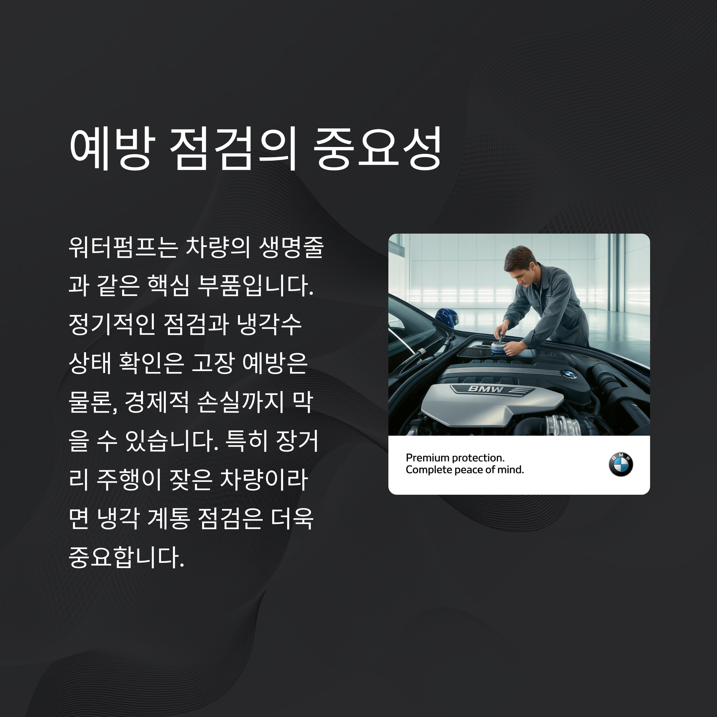 하지만 장기적으로 방치하면 워터펌프 손상 외에도 엔진에 직접적인 손상을 줄 수 있어, 수리비가 수백만 원으로 치솟을 수 있습니다.