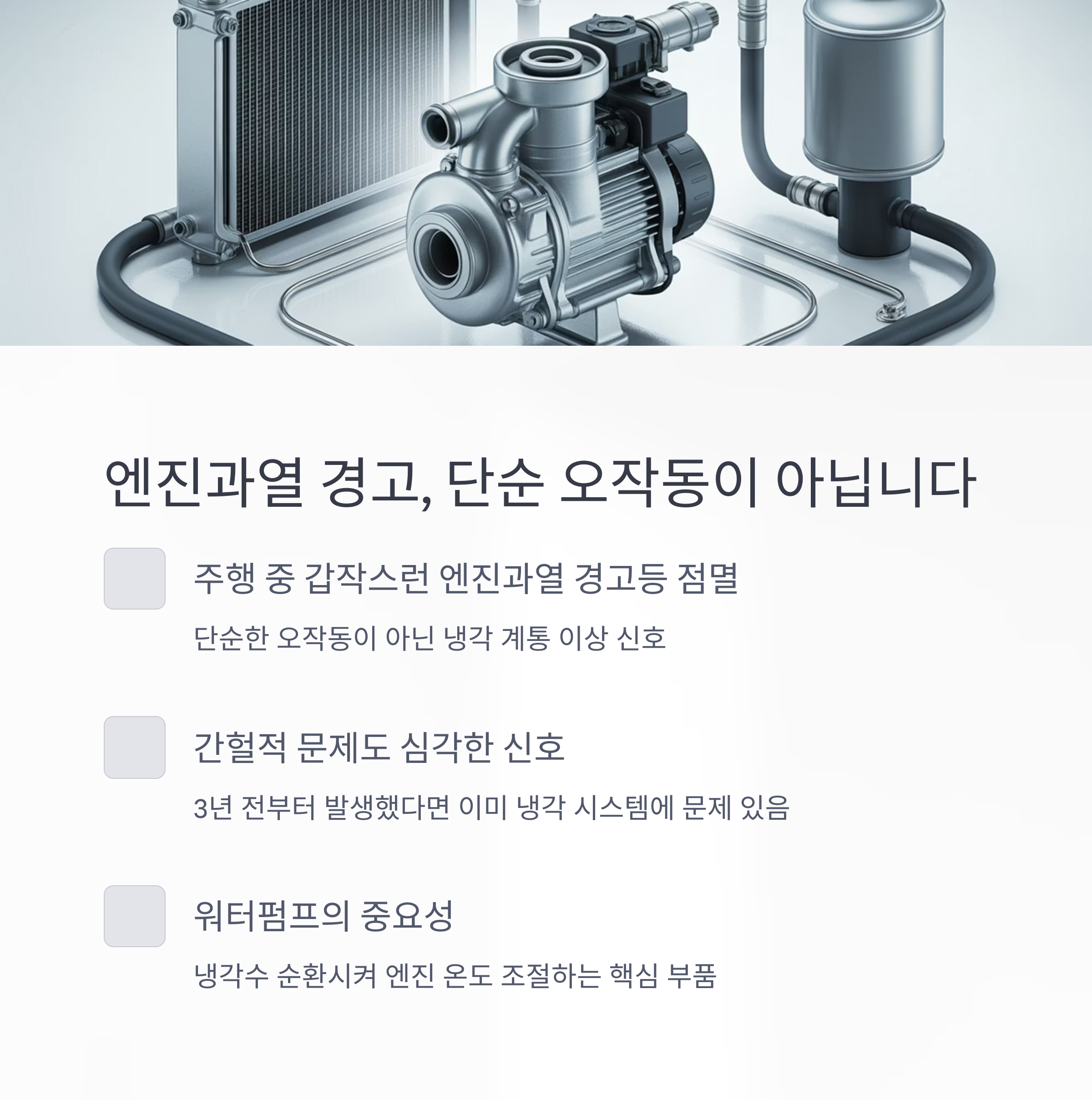 갑작스런 엔진과열 경고등이 주행 중에 점멸하거나 냉각수 온도가 점점 올라간다면 이는 단순한 오작동이 아닐 수 있습니다.
