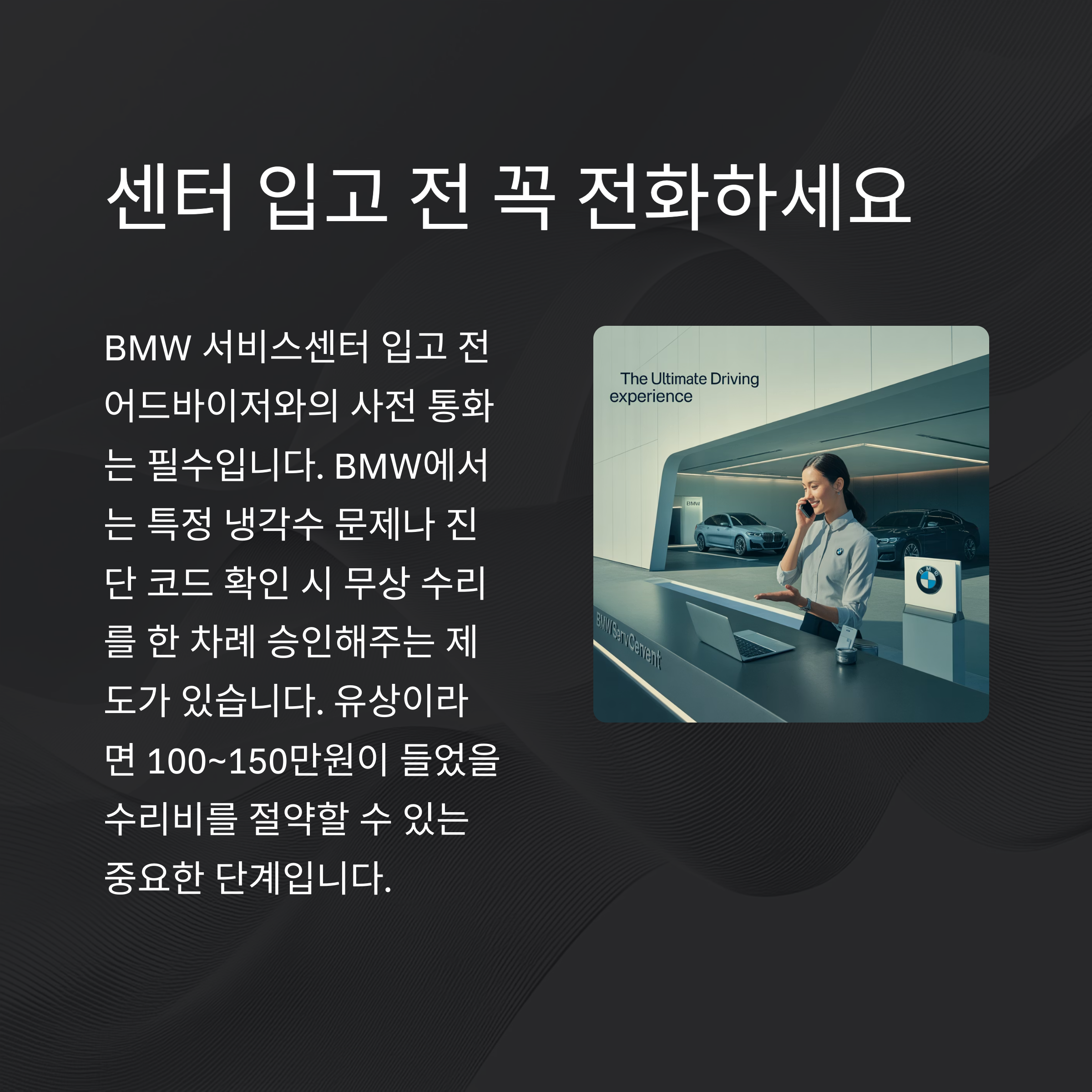 해당 사례처럼 BMW에서는 특정 냉각수 문제나 진단 코드가 확인될 경우, 무상 수리를 한 차례 승인해주는 제도가 존재합니다.
