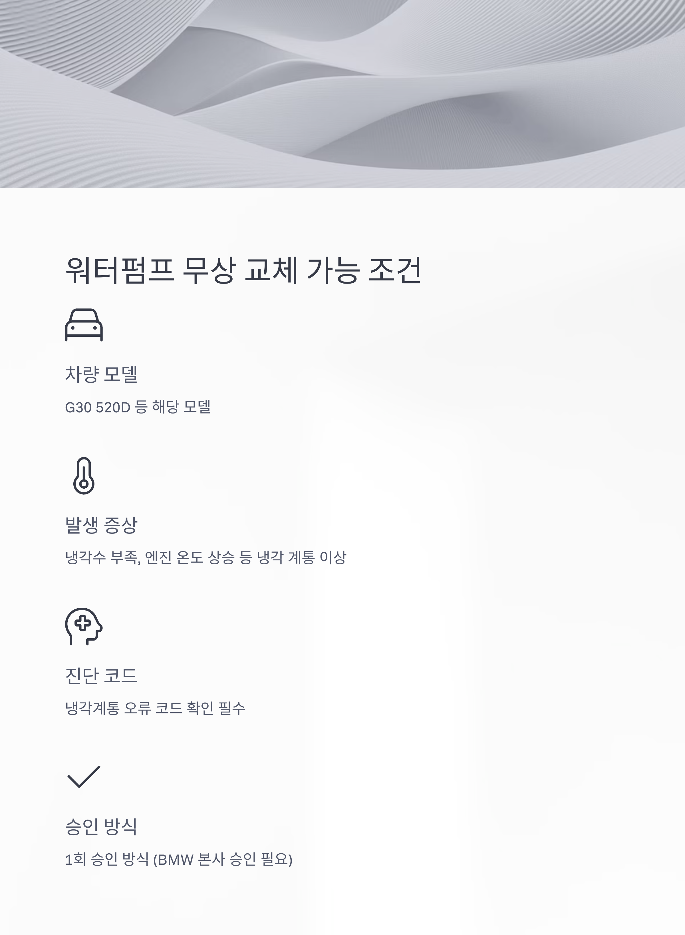 BMW G30 520D 차량을 타고 계신 오너라면 한 번쯤은 냉각수 경고등이나 엔진 과열 알림을 접해보셨을 수 있습니다. 특히 주행거리 15만km 이상, 차량 구입 후 5년 이상이 지난 경우라면 더욱 주의가 필요한데요. 오늘은 실제 2019년 9월에 구입한 G30 520D 차량이 워터펌프를 무상으로 교체받은 사례를 통해, 비슷한 증상을 겪고 있는 오너분들께 도움이 될 수 있는 정보를 전해드립니다.