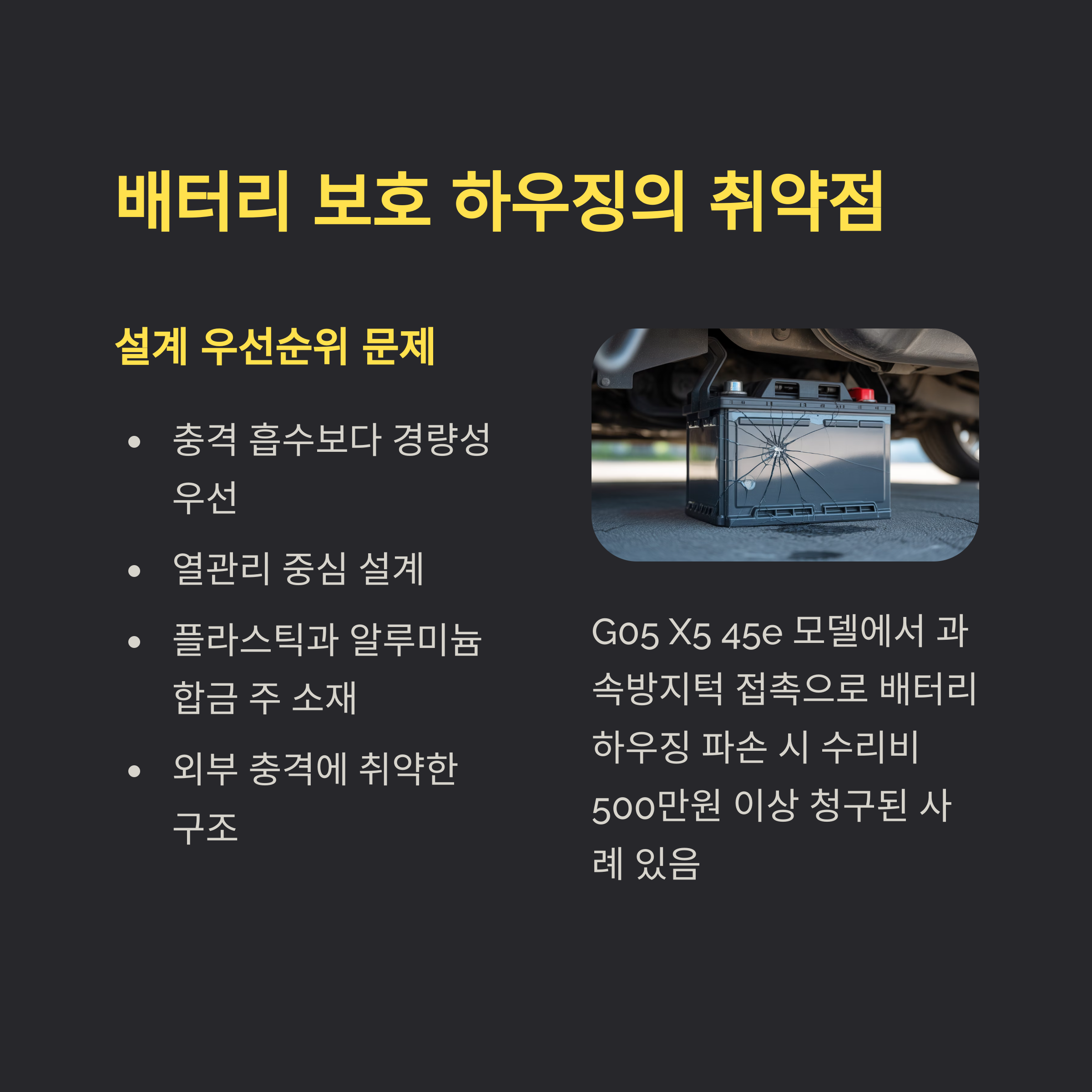 G05 X5 45e 차량에서는 과속방지턱 접촉으로 배터리 하우징이 파손된 사례가 존재하며,