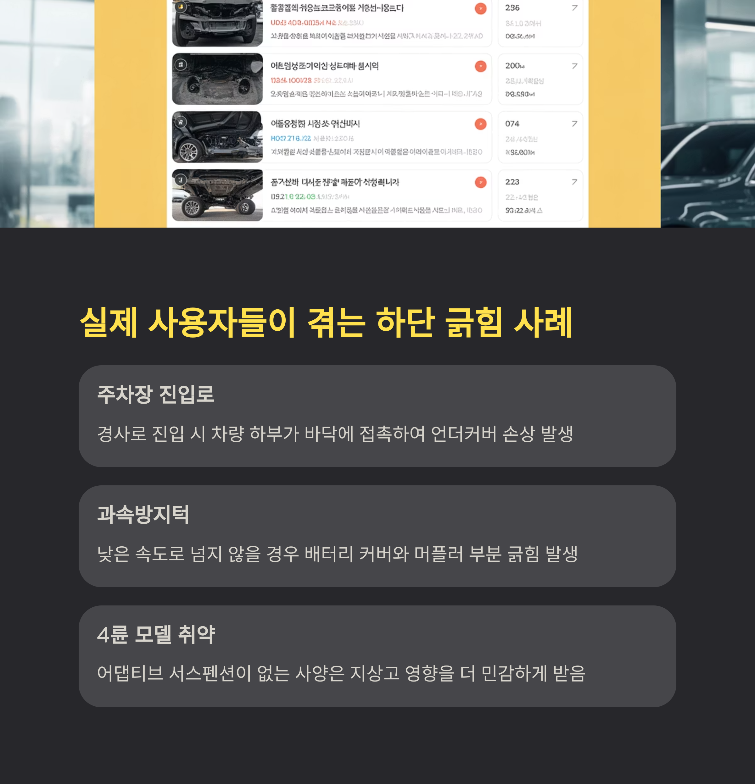 배터리 커버, 머플러 커버, 언더커버 등 손상이 발생할 수 있습니다.