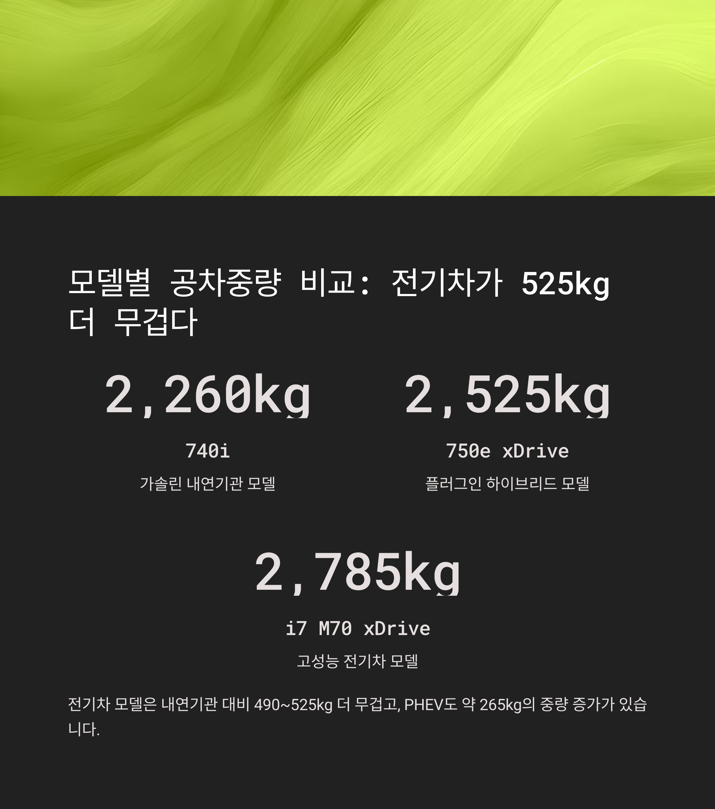 전기차 모델은 내연기관 대비 490~525kg가량 더 무겁고, PHEV도 약 265kg 중량 증가가 있습니다.