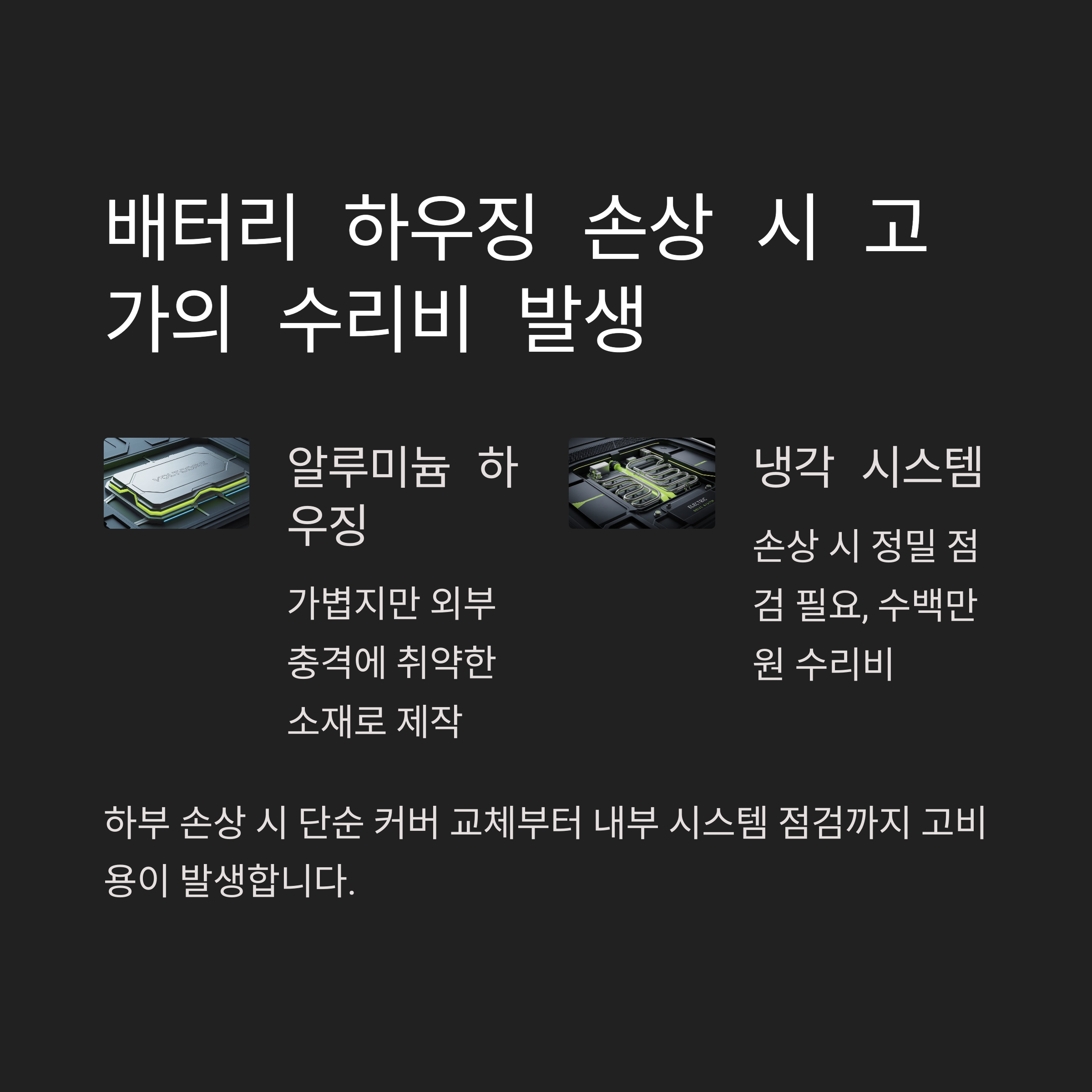 특히 배터리 하우징의 손상은 일부 보험 상품에서는 제외 항목으로 처리되기도 합니다.