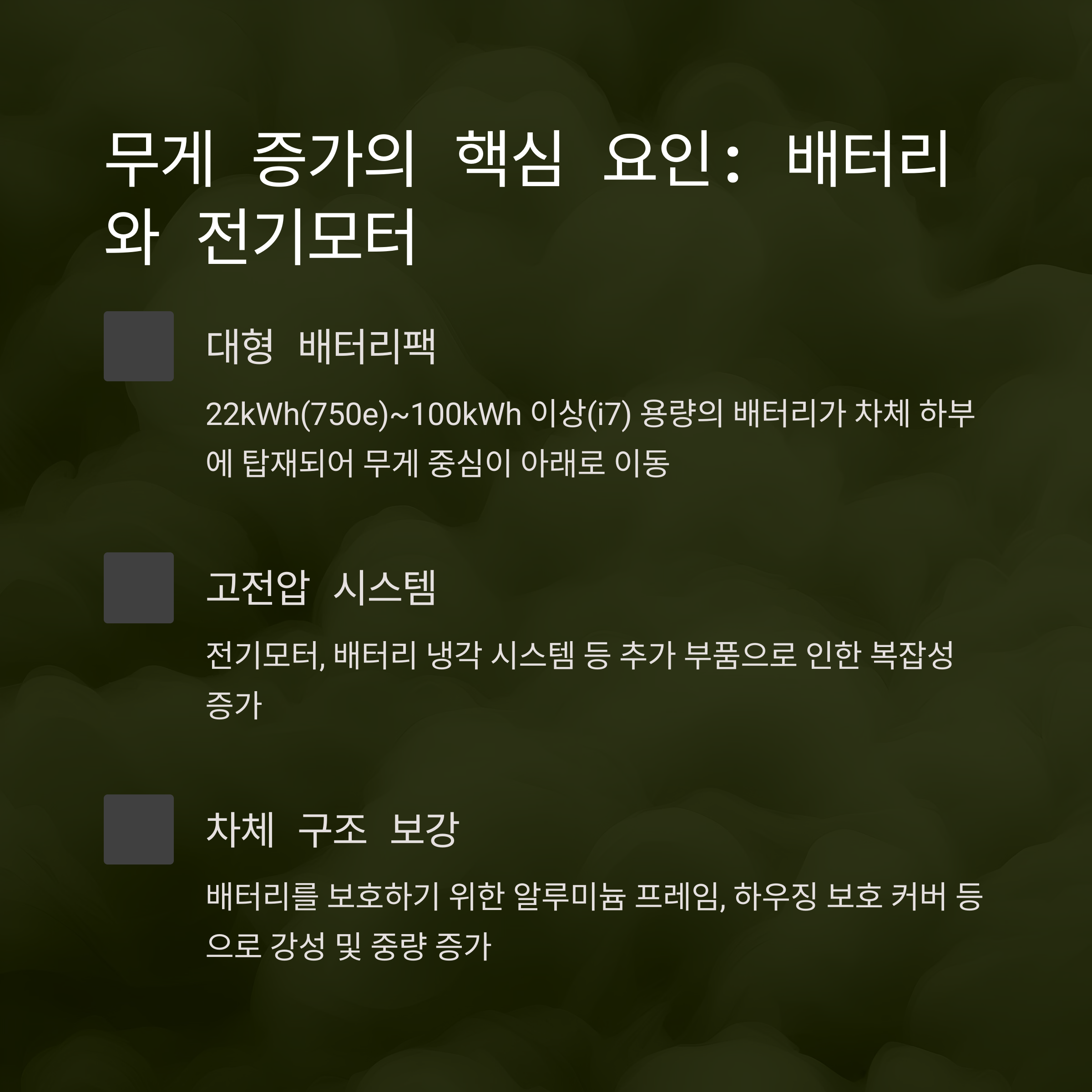 G70 전기차와 PHEV 모델의 공차중량 증가 원인은 크게 세 가지로 요약할 수 있습니다.