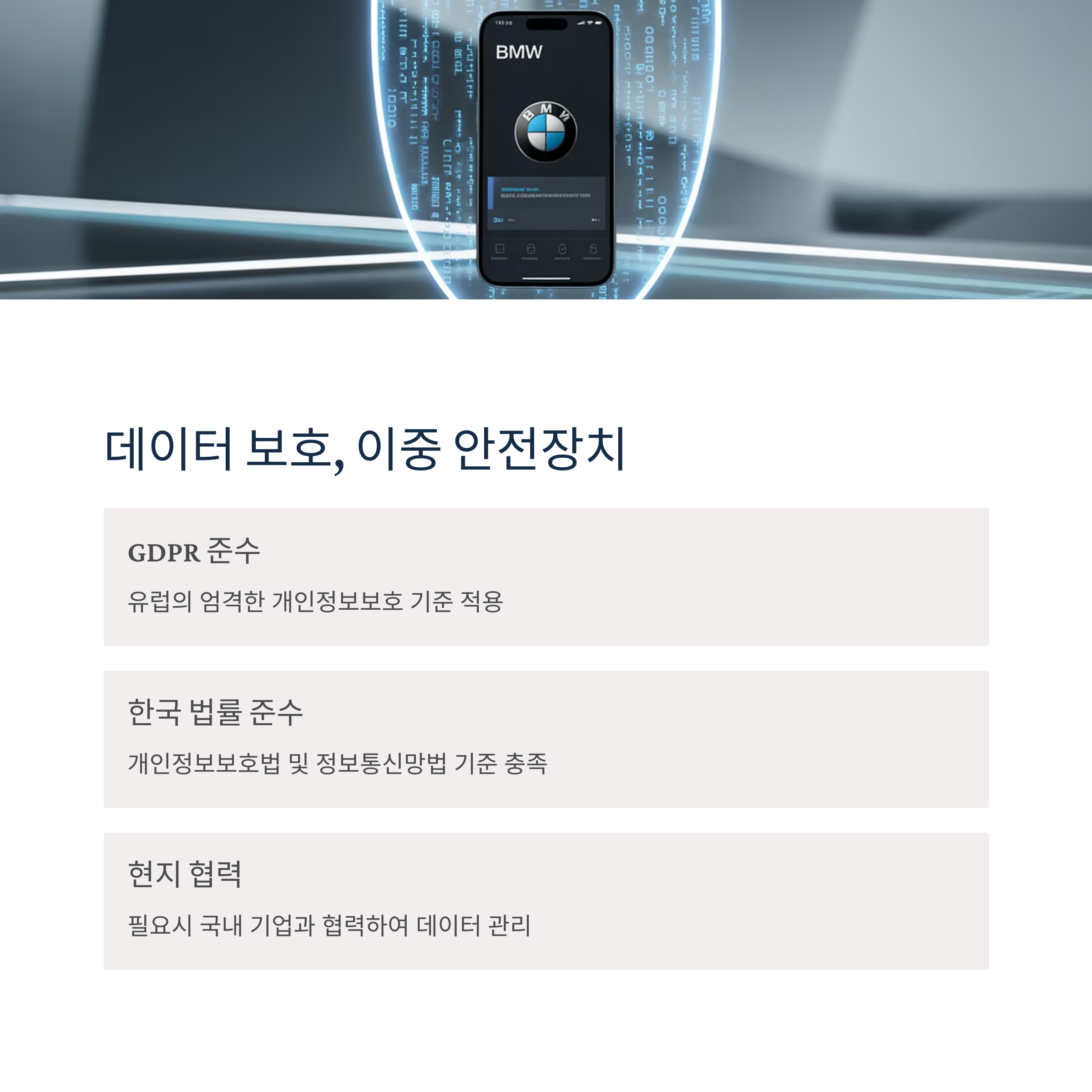 BMW는 GDPR 외에도 각 국가의 개인정보 보호법을 준수합니다.