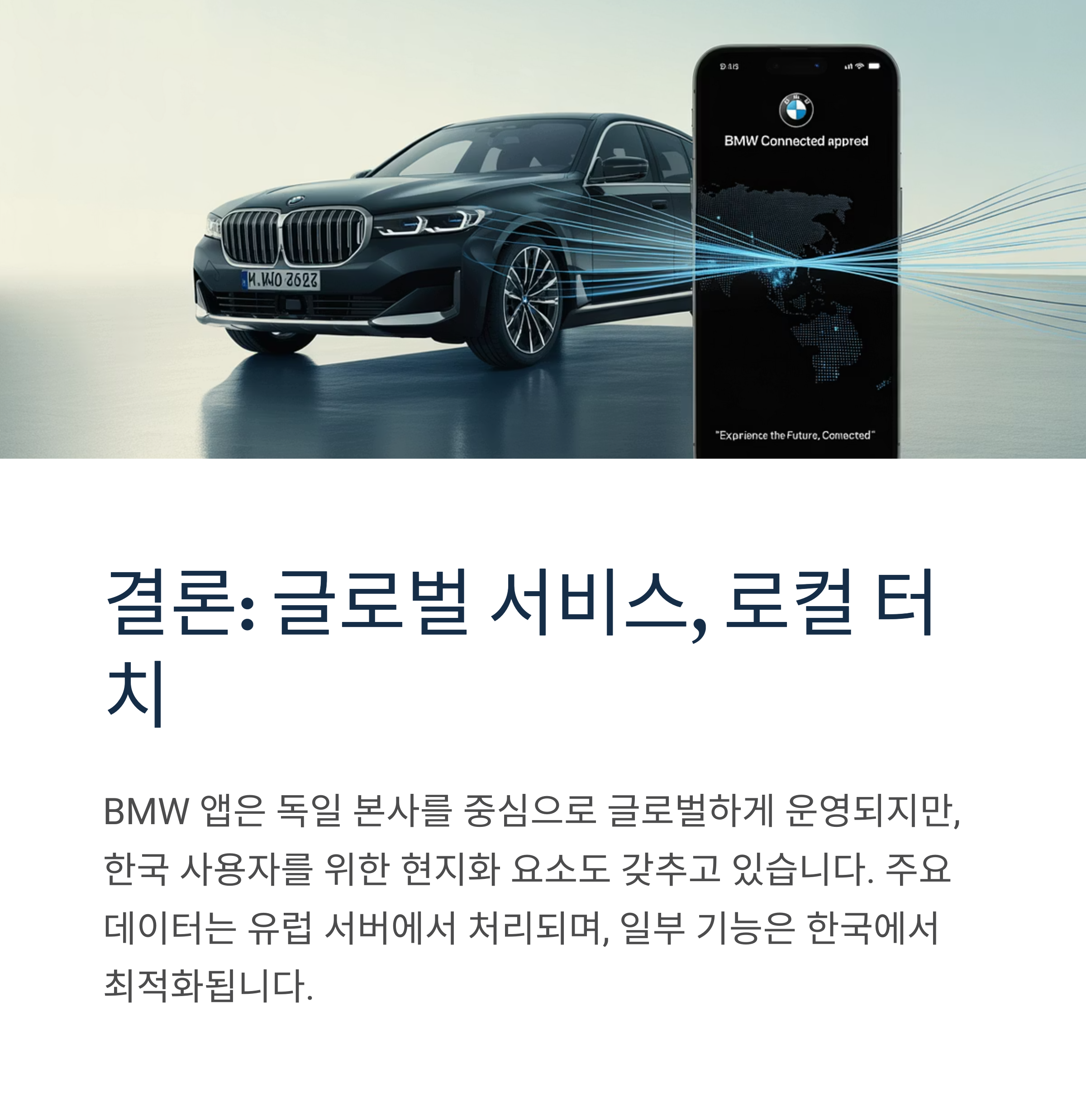 BMW 어플의 서버는 단지 한국에만 국한된 것이 아니라, BMW 본사인 독일을 중심으로 한 글로벌 서버 인프라에 기반하고 있습니다. 다만, 한국 사용자에 맞춘 현지화된 요소들도 일부 반영되어 운영됩니다.