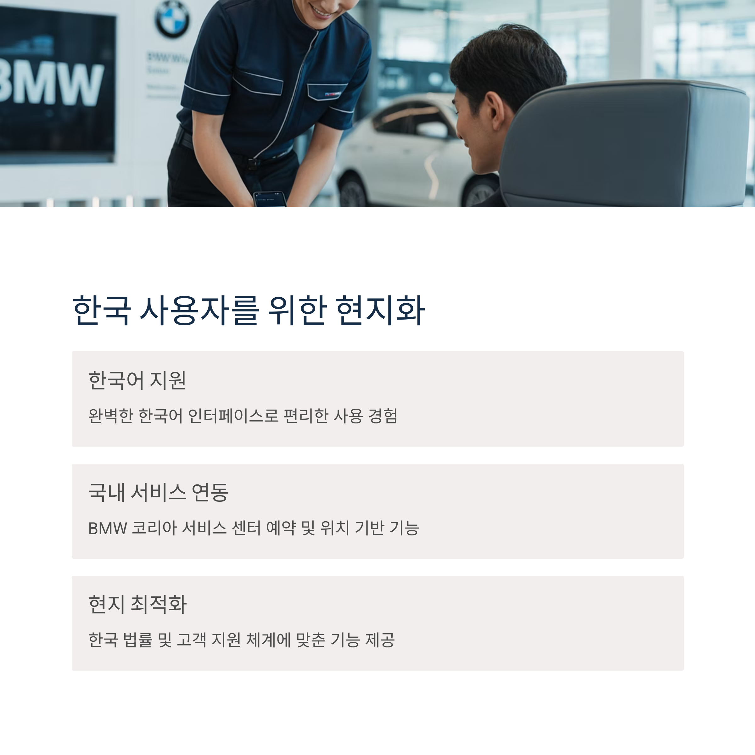서비스 센터 예약이나 위치 기반 기능 일부는 한국 내 협력사와 연동되어