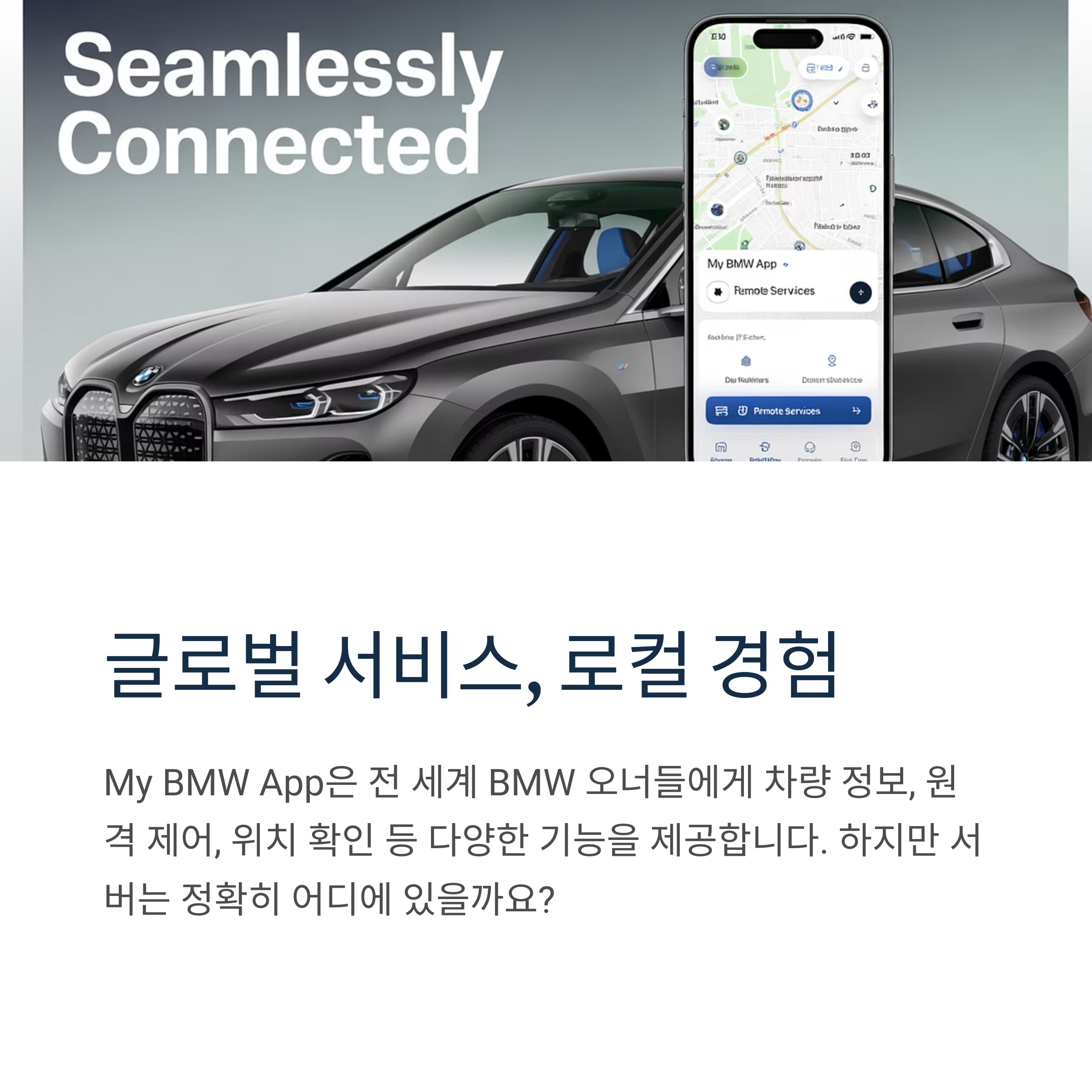 BMW 어플의 서버는 단지 한국에만 국한된 것이 아니라, BMW 본사인 독일을 중심으로 한 글로벌 서버 인프라에 기반하고 있습니다. 다만, 한국 사용자에 맞춘 현지화된 요소들도 일부 반영되어 운영됩니다.